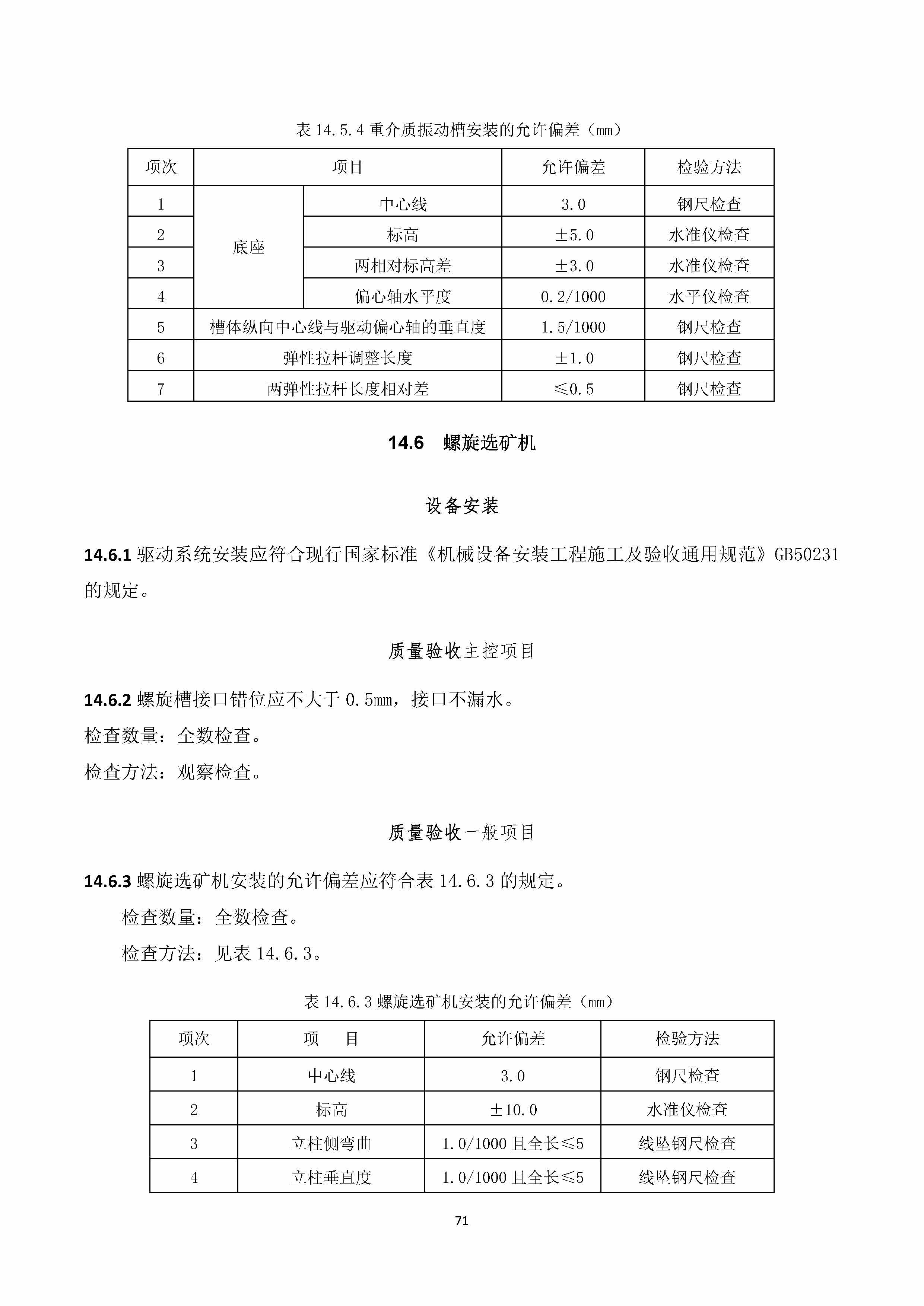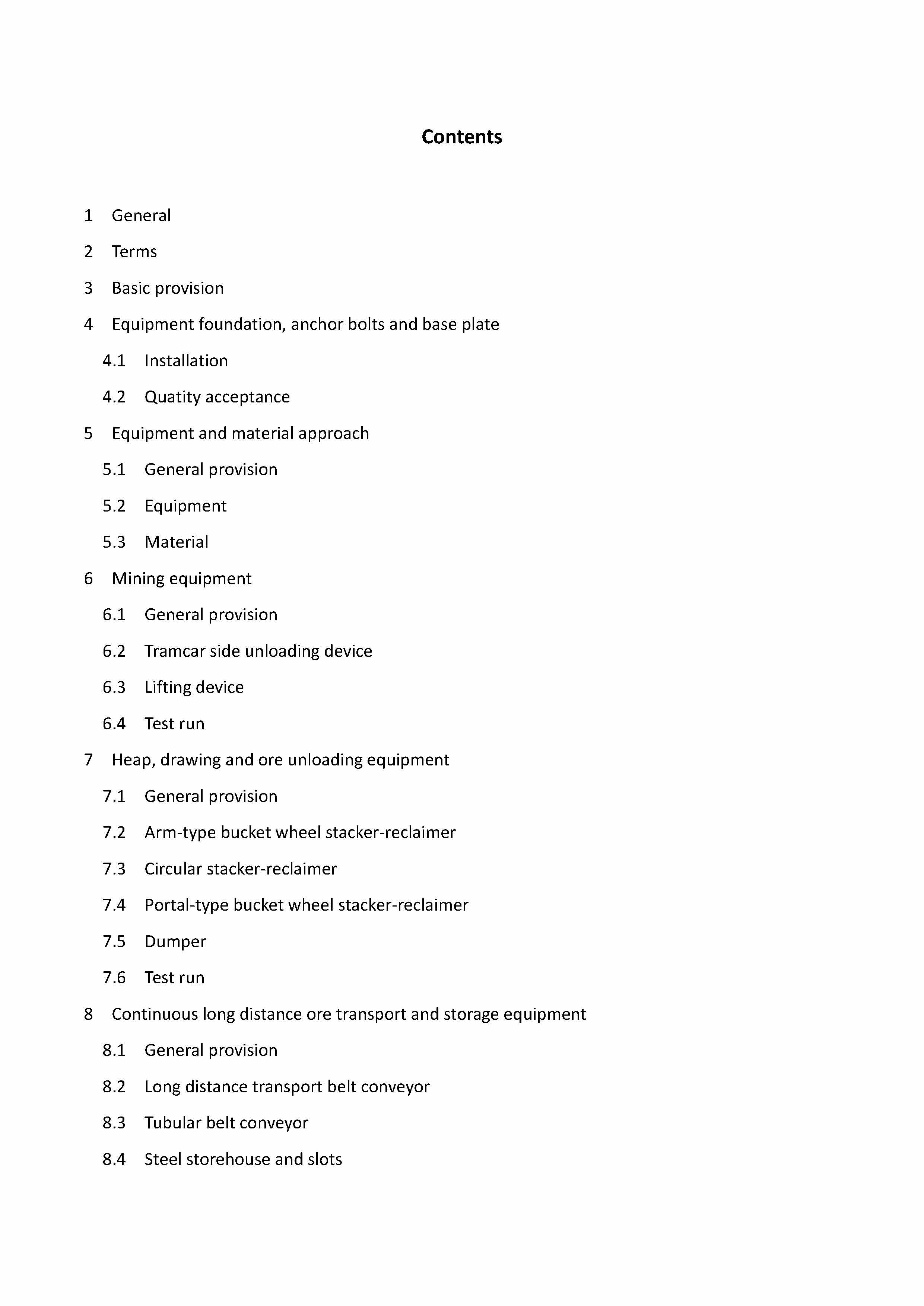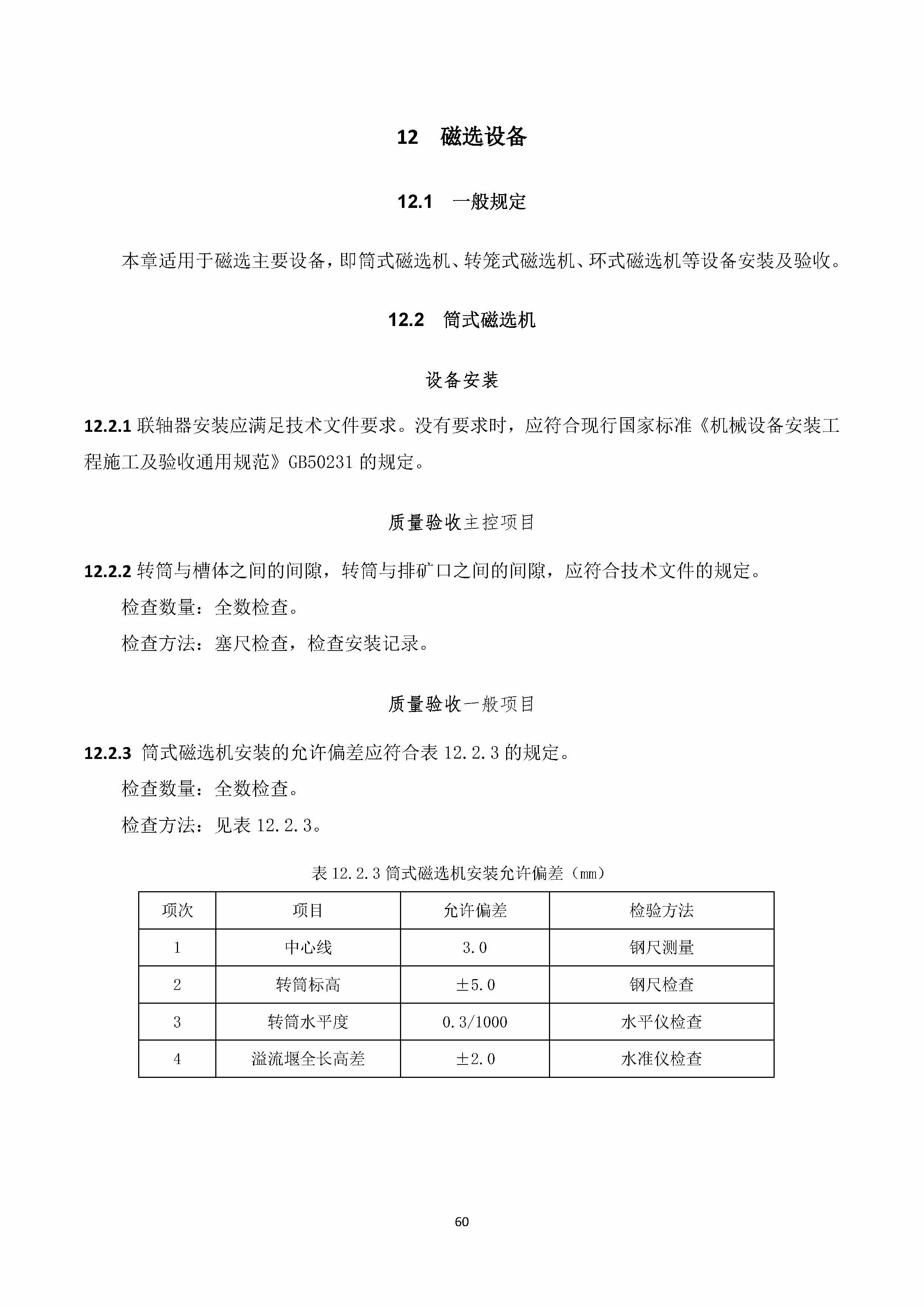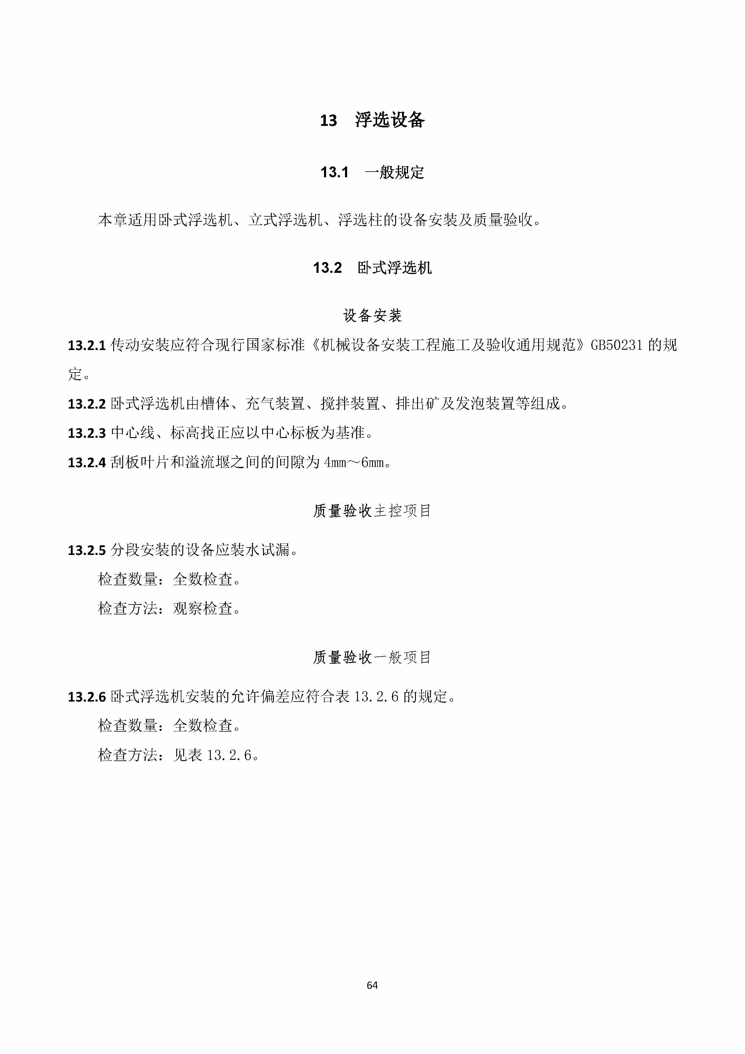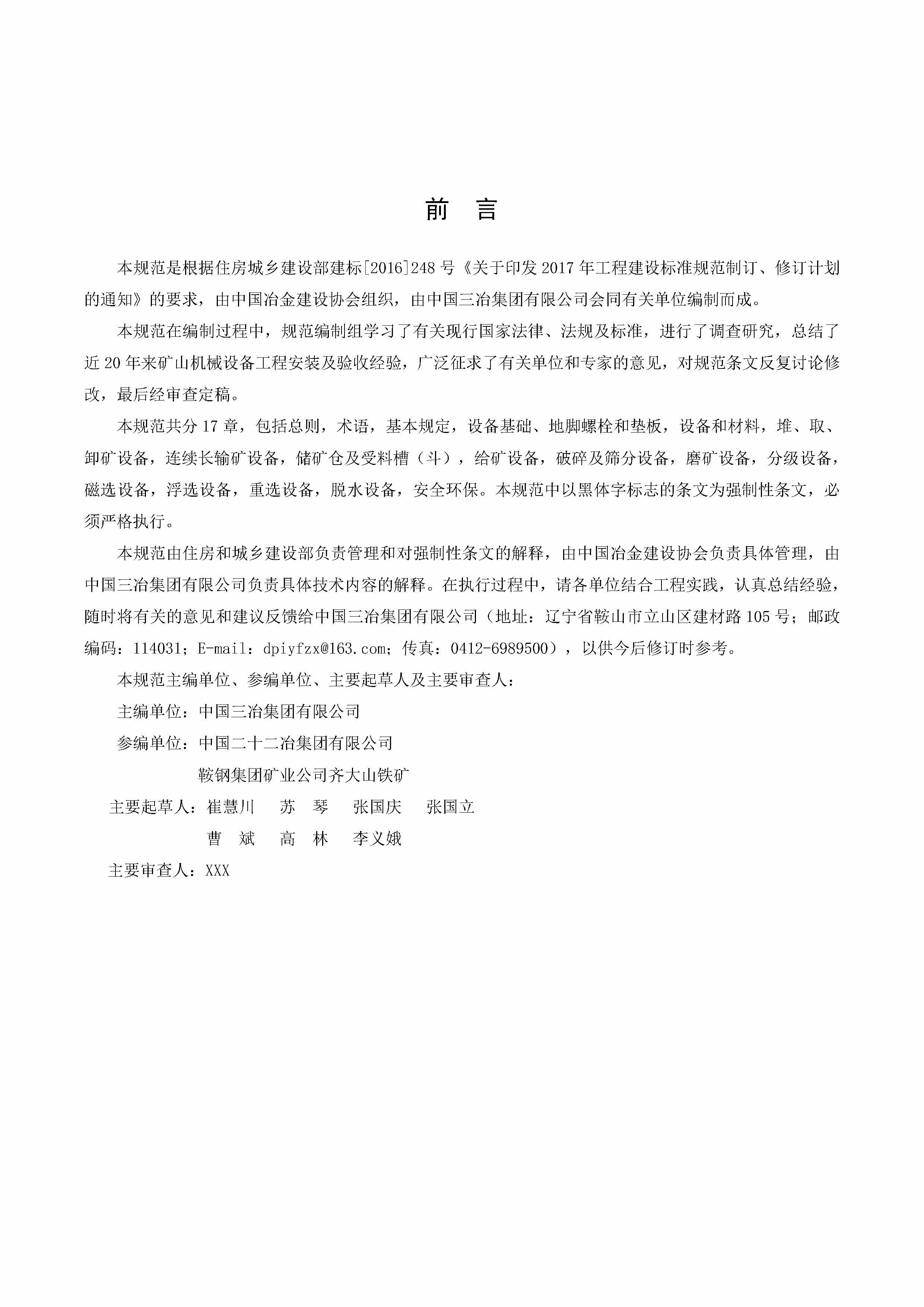 本規范共分17章,包括總則,術語,基本規定,設備基礎、地腳螺栓和墊板,設備和材料,堆、取、卸礦設備,連續長輸礦設備,儲礦倉及受料槽(斗),給礦設備,破碎及篩分設備,磨礦設備,分級設備,磁選設備,浮選設備,重選設備,脫水設備,安全環保。本規范中以黑體字標志的條文為*性條文,必須嚴格執行。