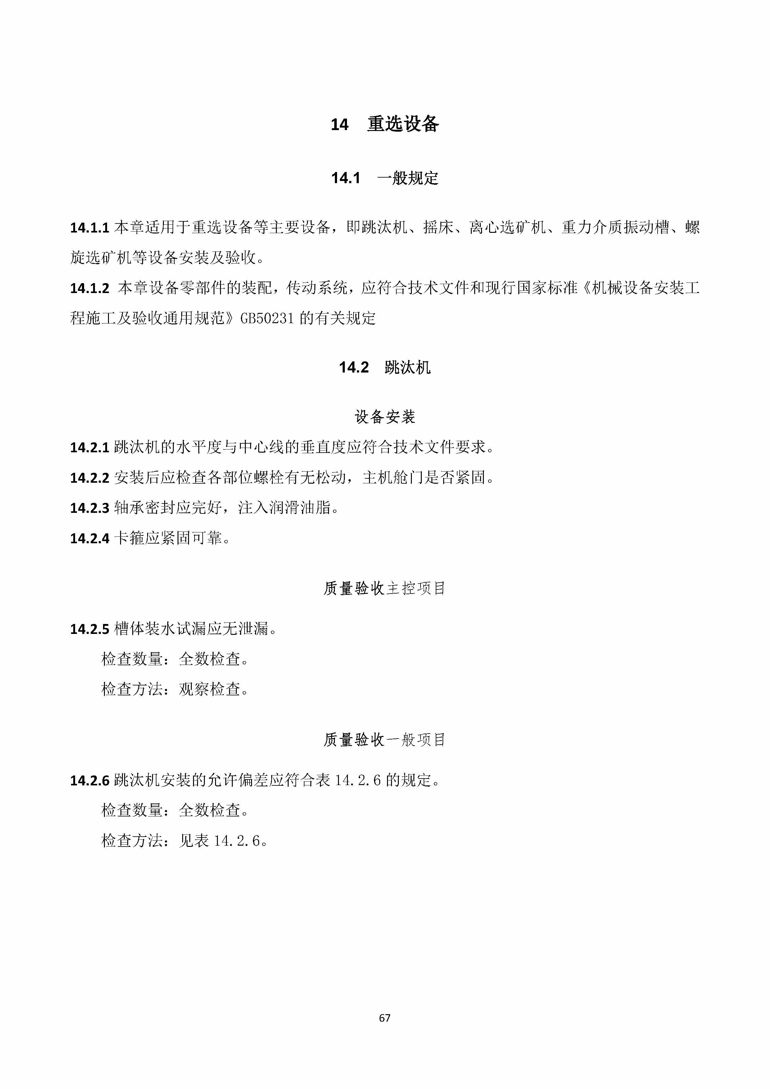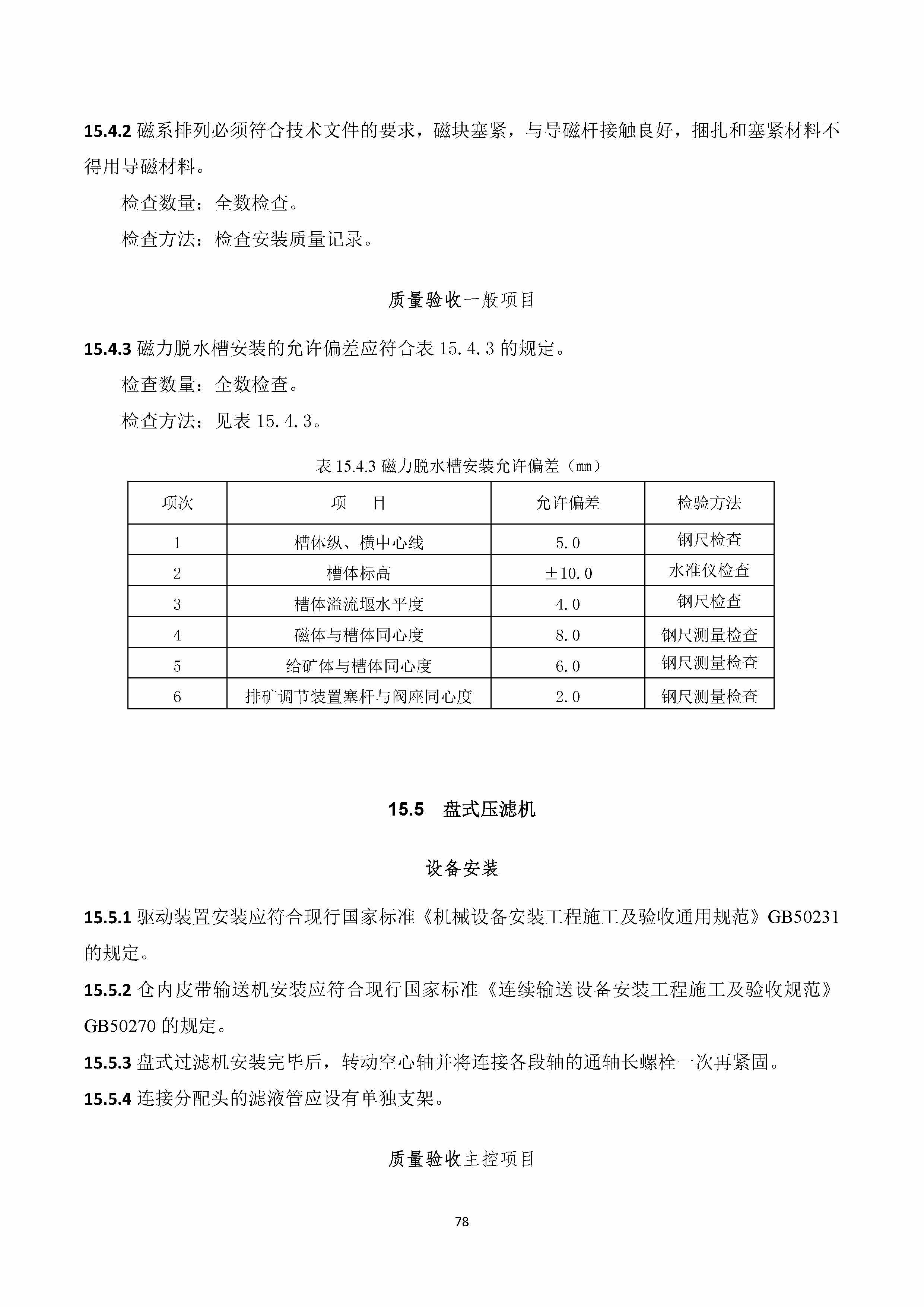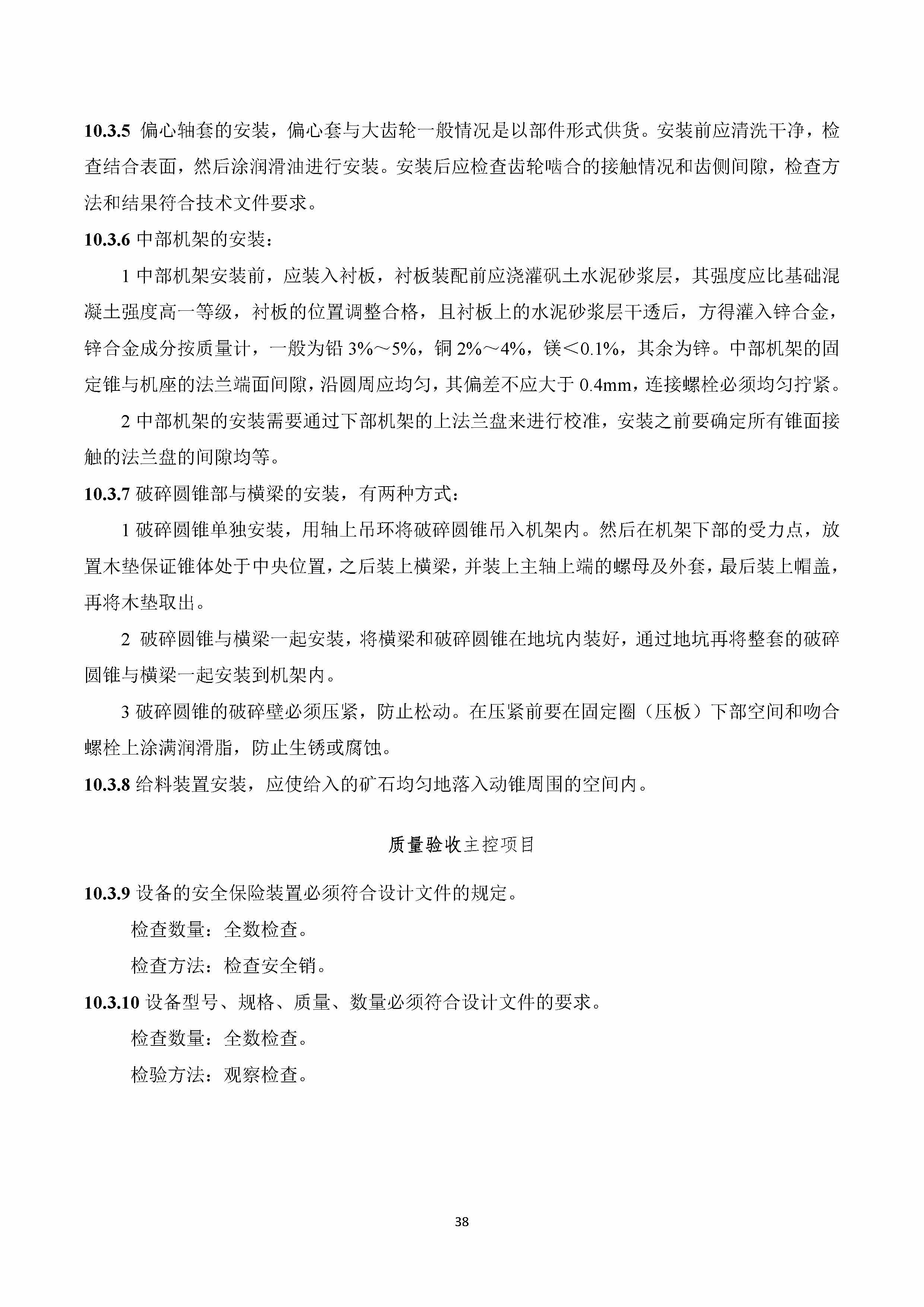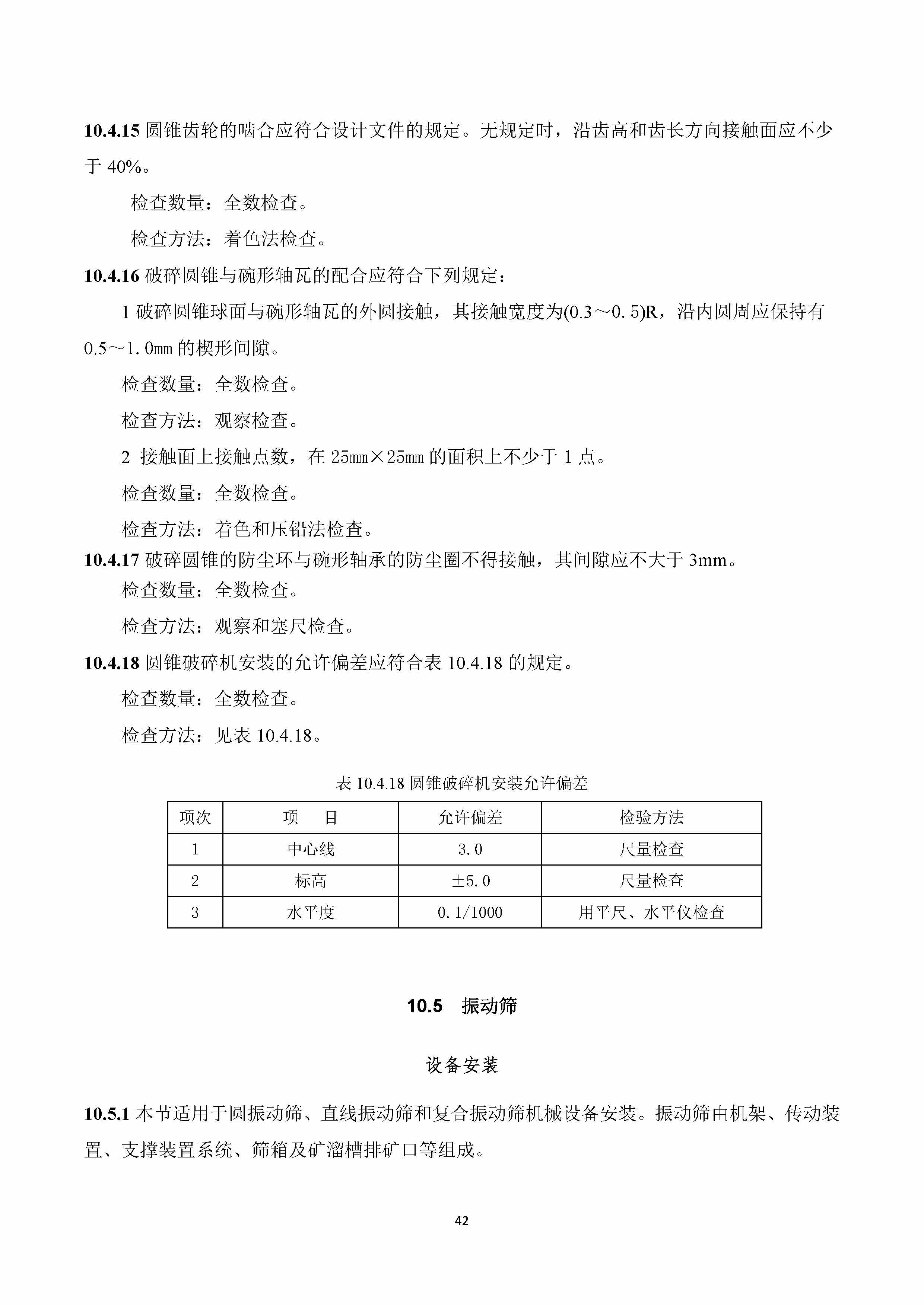 本規范共分17章,包括總則,術語,基本規定,設備基礎、地腳螺栓和墊板,設備和材料,堆、取、卸礦設備,連續長輸礦設備,儲礦倉及受料槽(斗),給礦設備,破碎及篩分設備,磨礦設備,分級設備,磁選設備,浮選設備,重選設備,脫水設備,安全環保。本規范中以黑體字標志的條文為*性條文,必須嚴格執行。