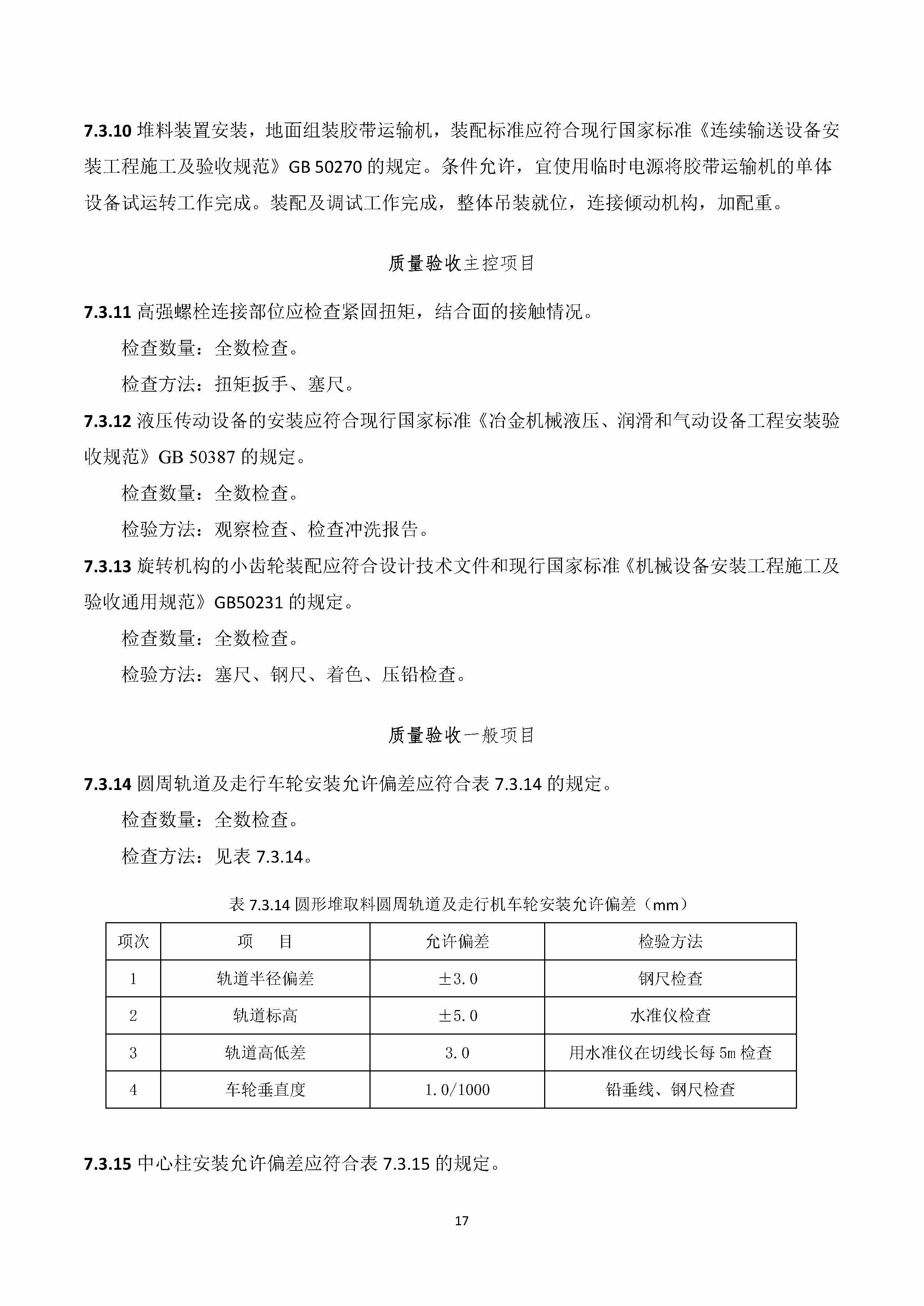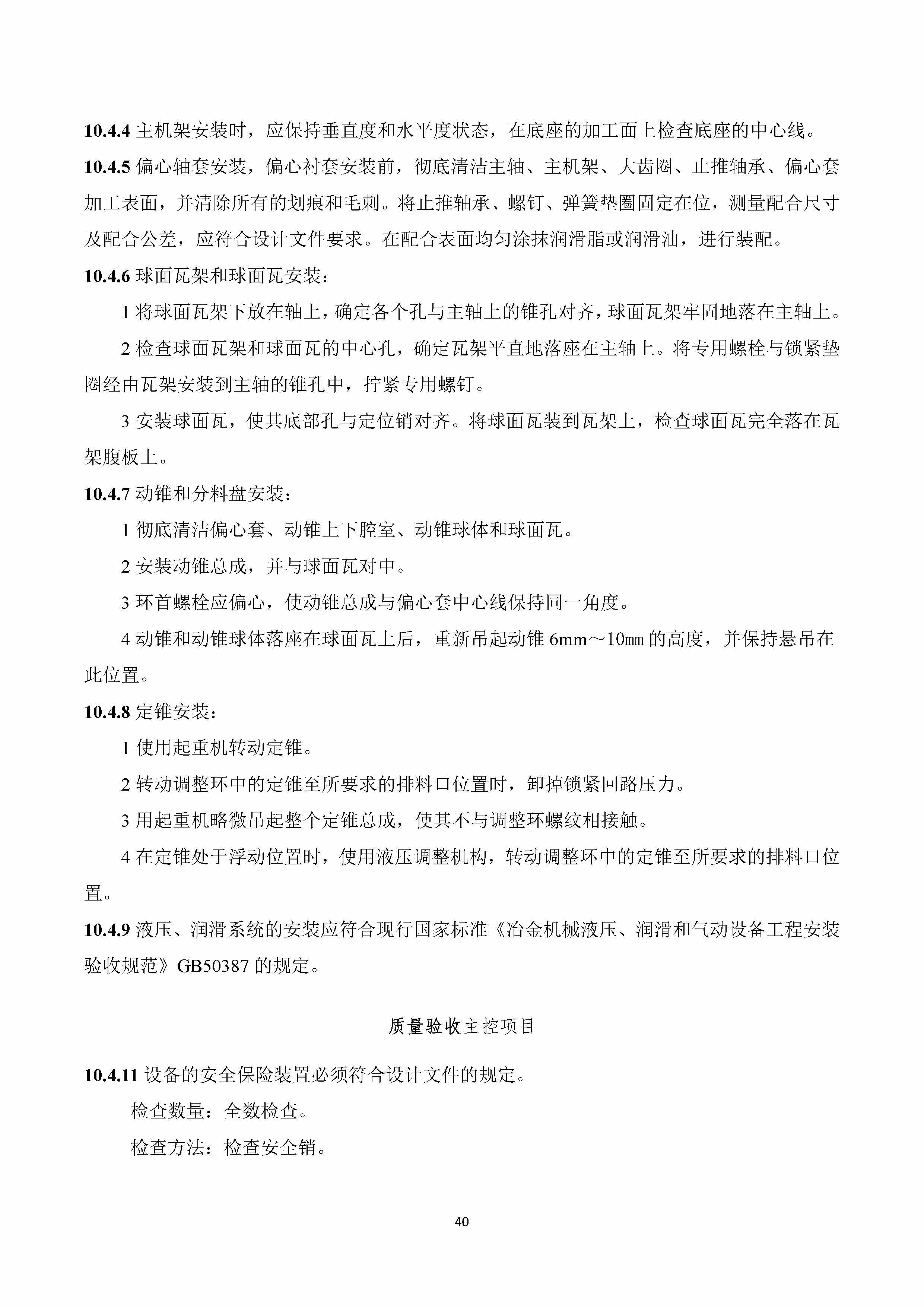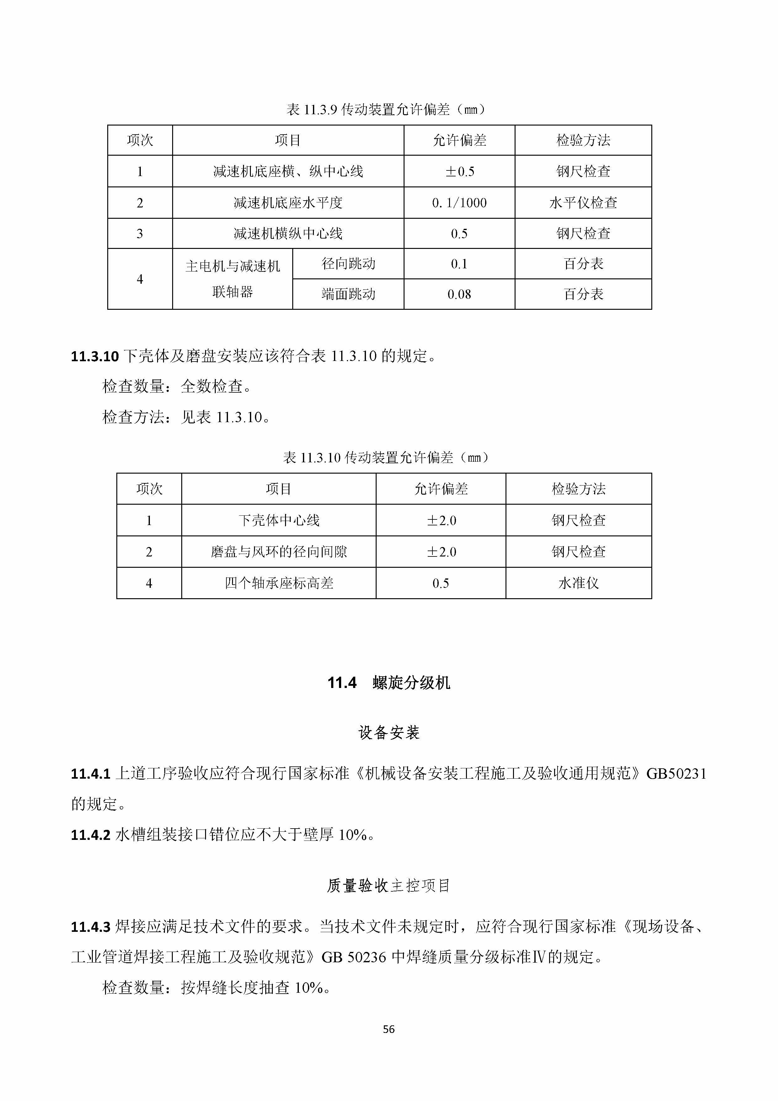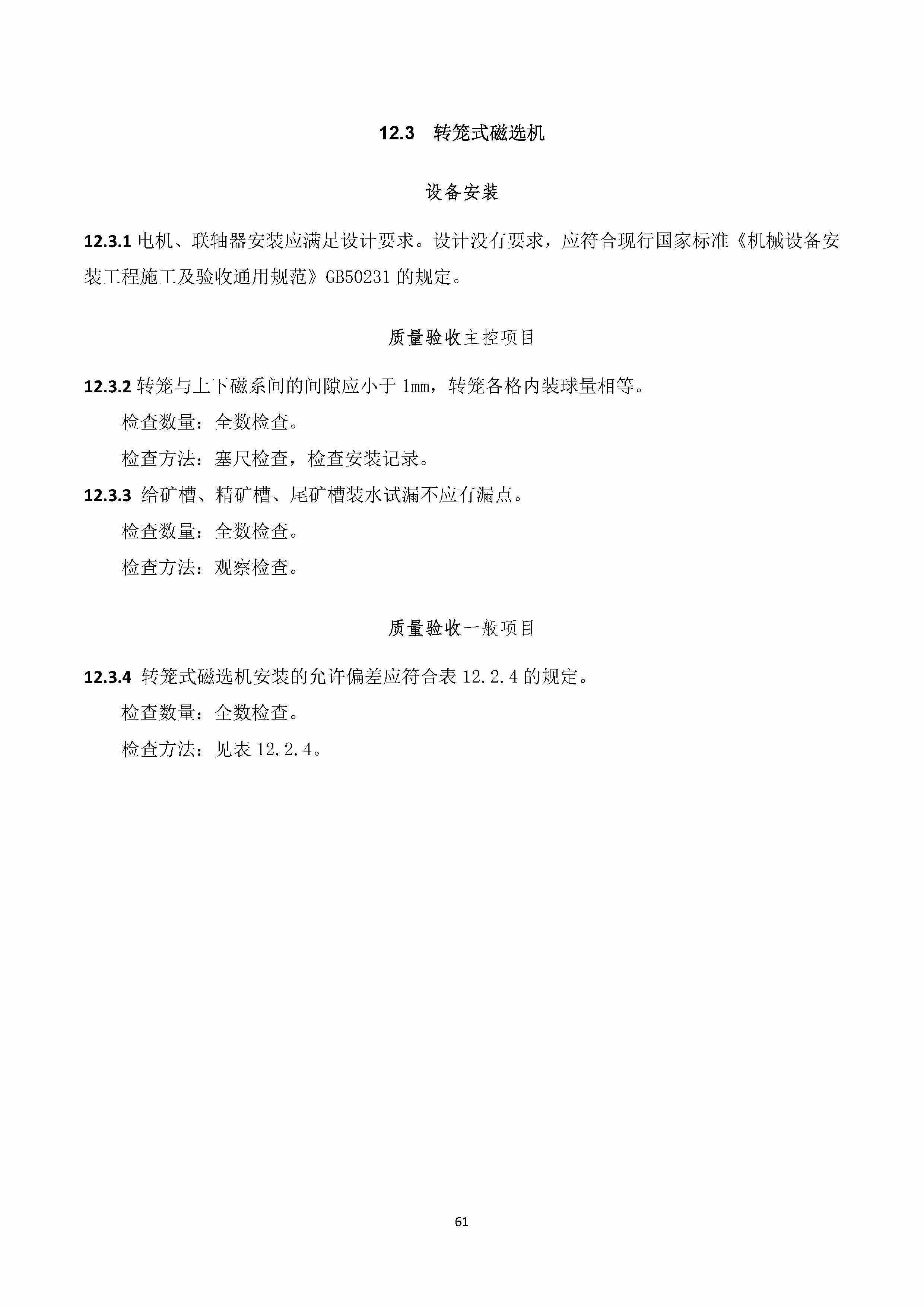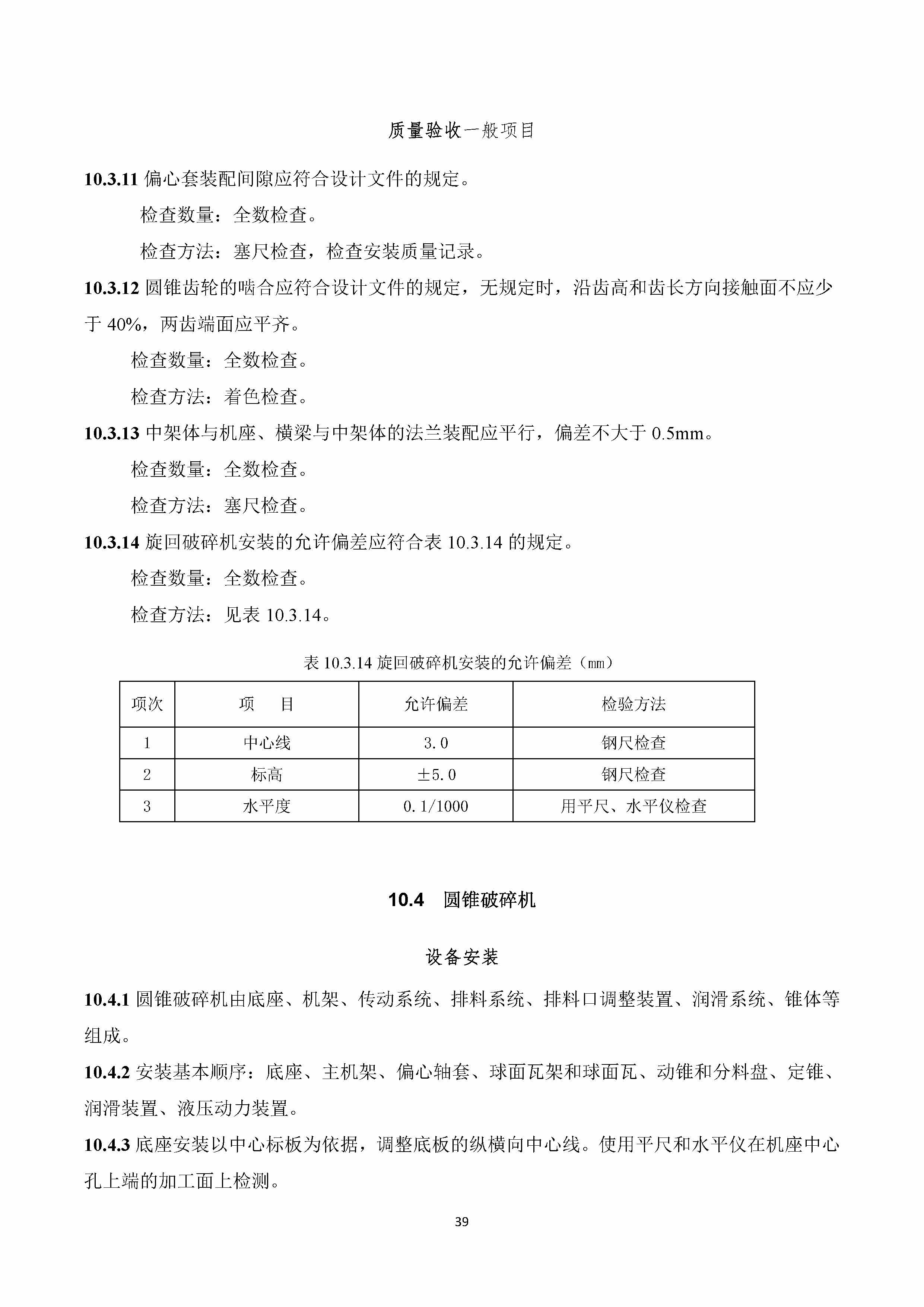 本規范共分17章,包括總則,術語,基本規定,設備基礎、地腳螺栓和墊板,設備和材料,堆、取、卸礦設備,連續長輸礦設備,儲礦倉及受料槽(斗),給礦設備,破碎及篩分設備,磨礦設備,分級設備,磁選設備,浮選設備,重選設備,脫水設備,安全環保。本規范中以黑體字標志的條文為*性條文,必須嚴格執行。
