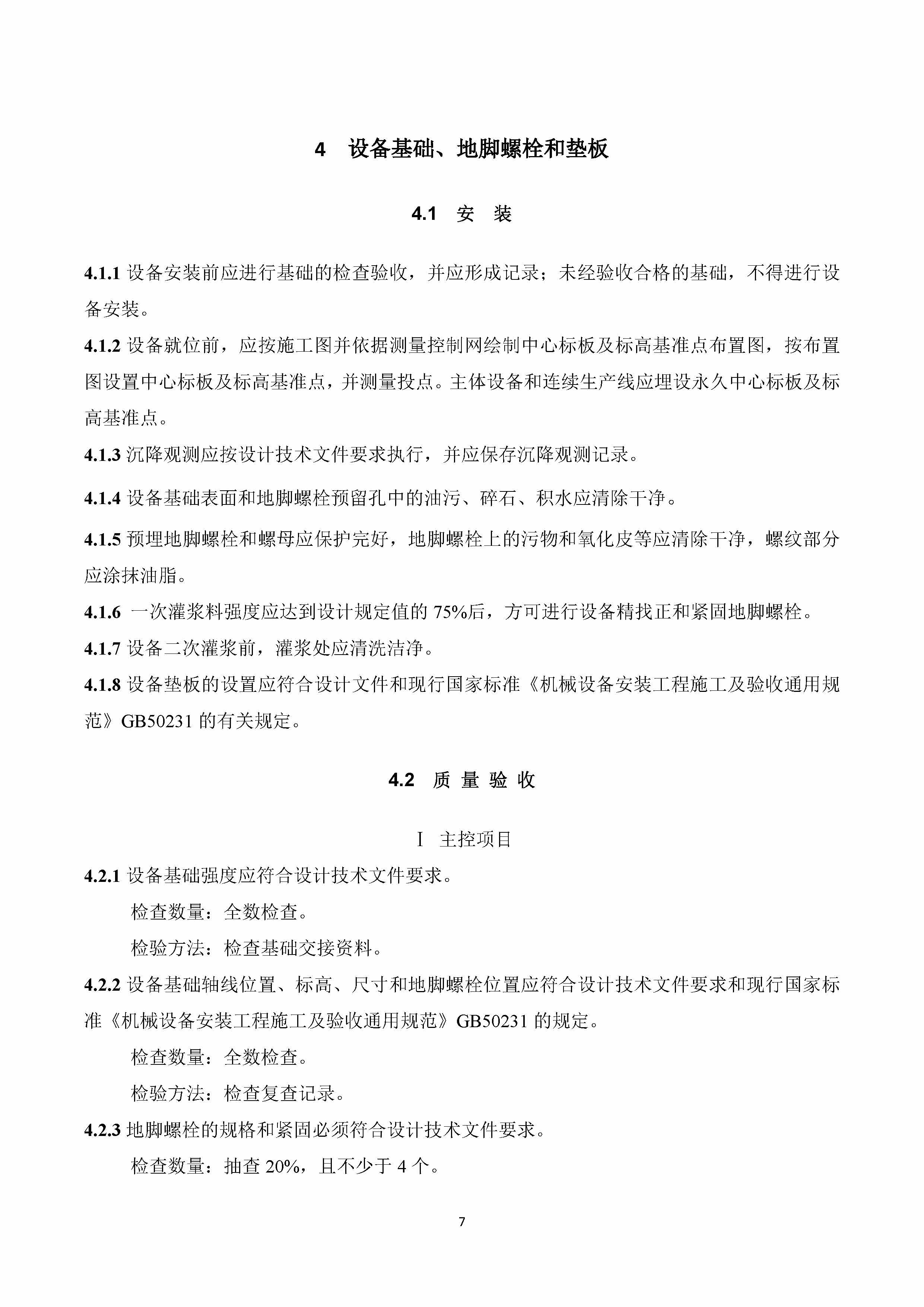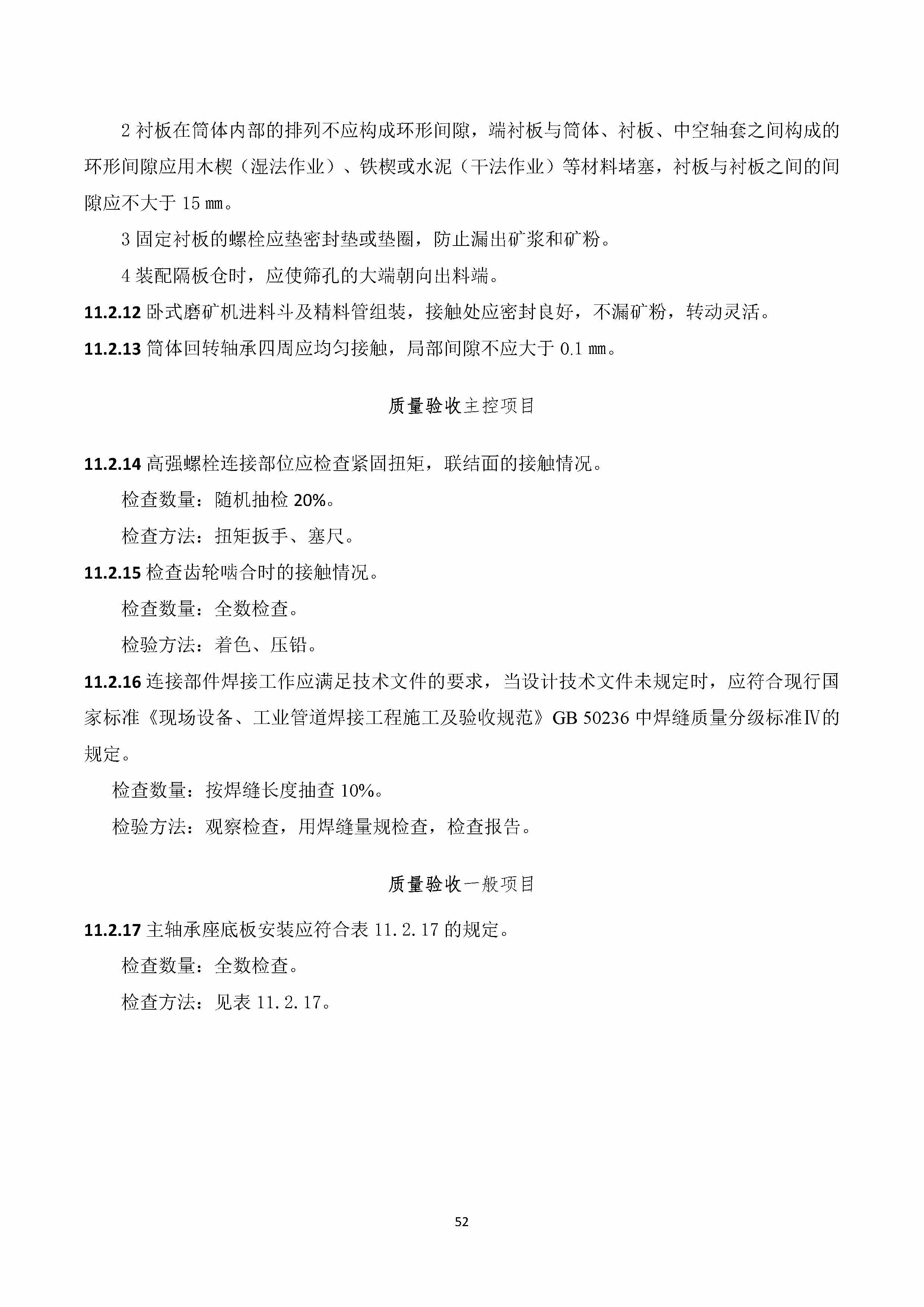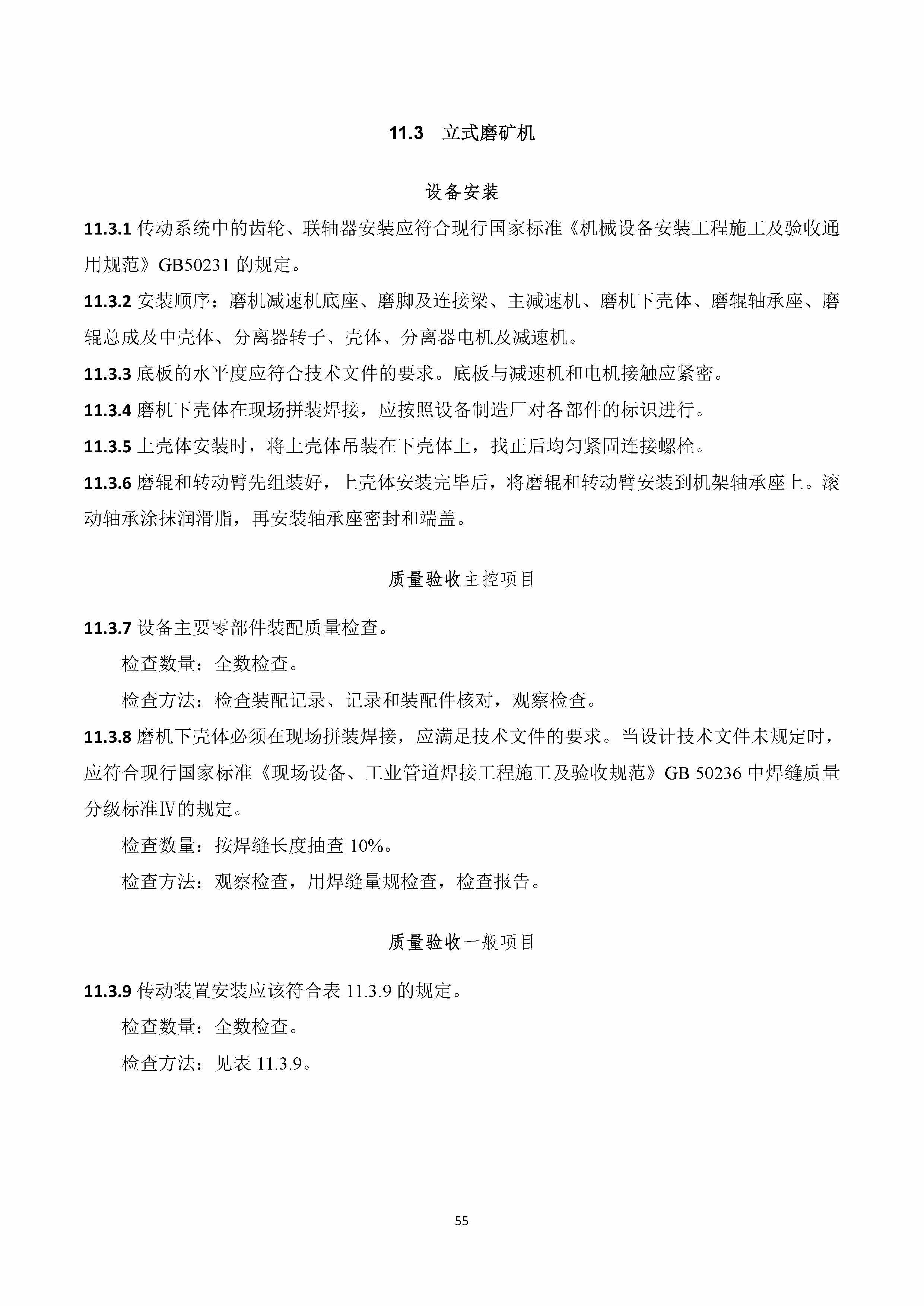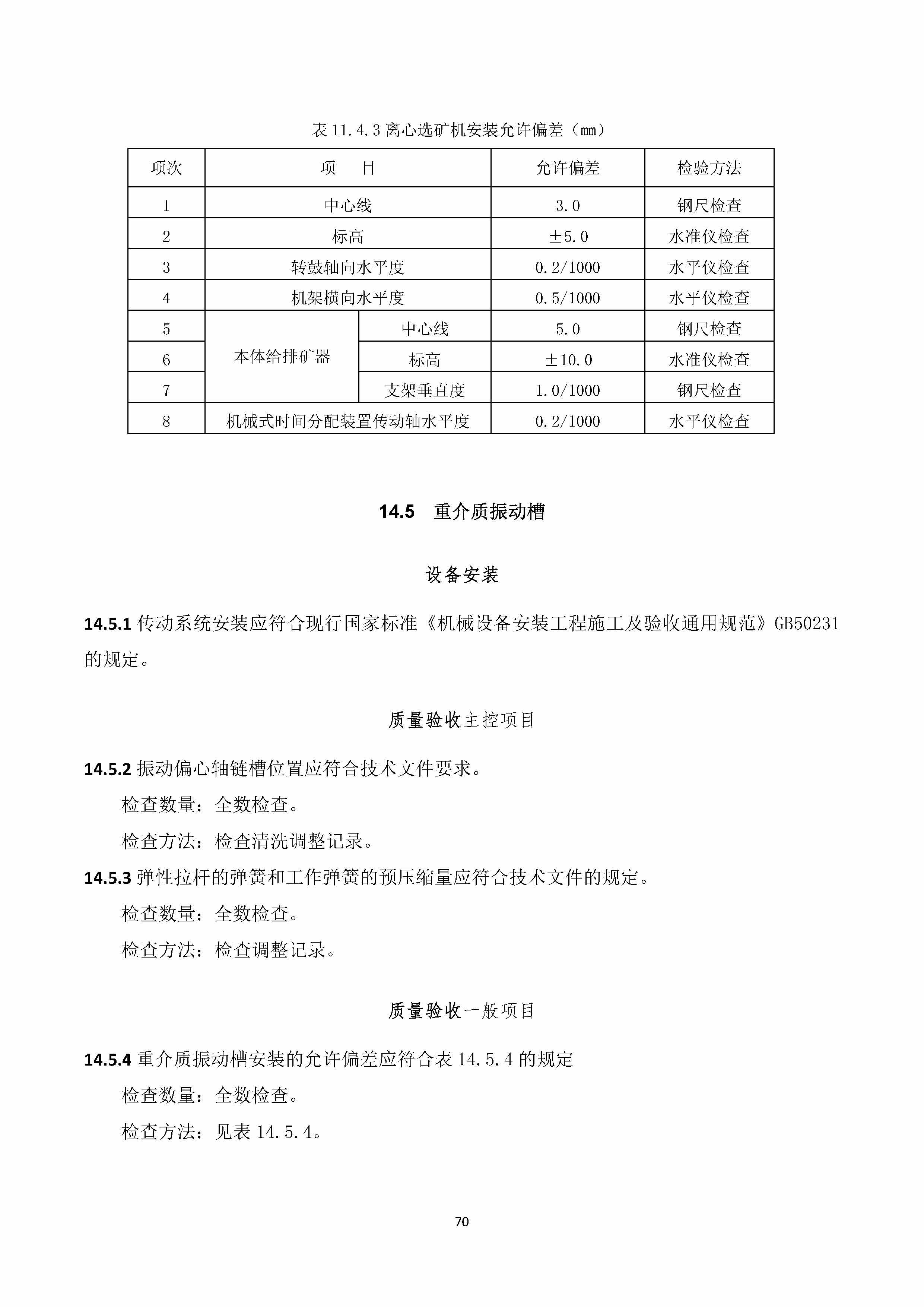 本規范共分17章,包括總則,術語,基本規定,設備基礎、地腳螺栓和墊板,設備和材料,堆、取、卸礦設備,連續長輸礦設備,儲礦倉及受料槽(斗),給礦設備,破碎及篩分設備,磨礦設備,分級設備,磁選設備,浮選設備,重選設備,脫水設備,安全環保。本規范中以黑體字標志的條文為*性條文,必須嚴格執行。