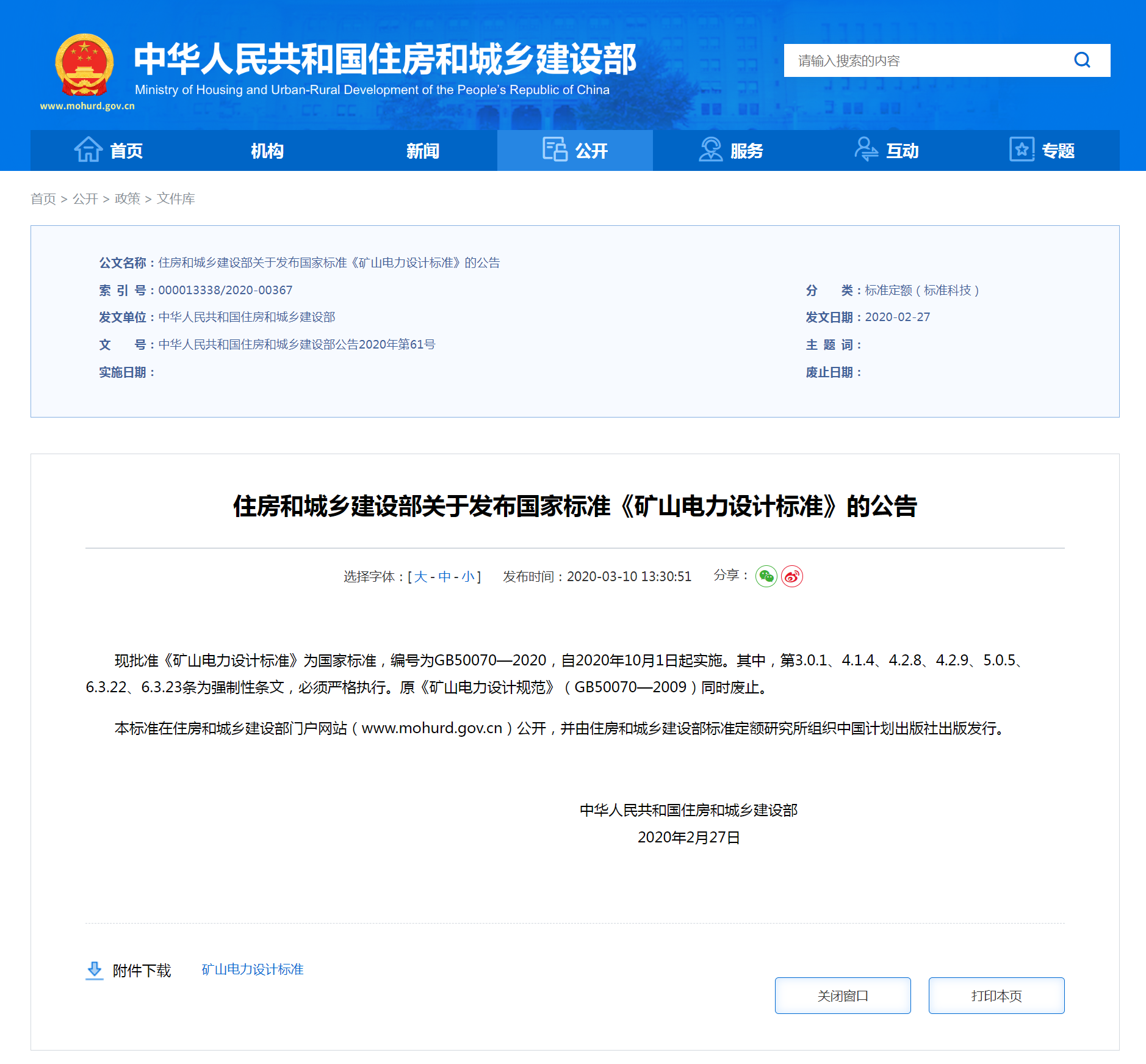 住房和城鄉建設部關于發布國家標準《礦山電力設計標準》的公告