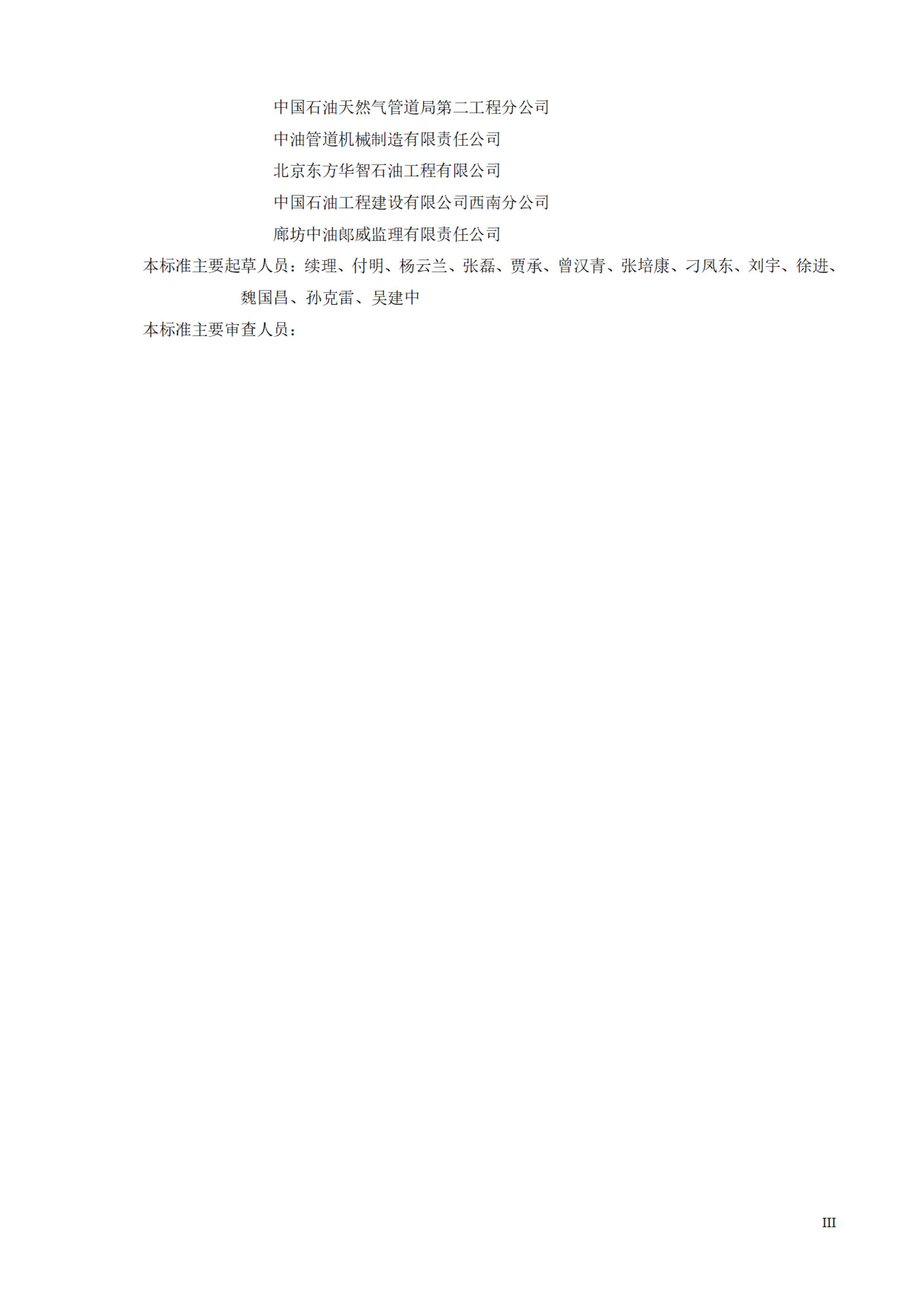 根據《住房和城鄉建設部關于印發2020年工程建設規范標準編制及相關工作計劃的通知》(建標函〔2020〕9號)的要求,中國石油天然氣管道局工程有限公司會同有關單位修訂完成本標準。