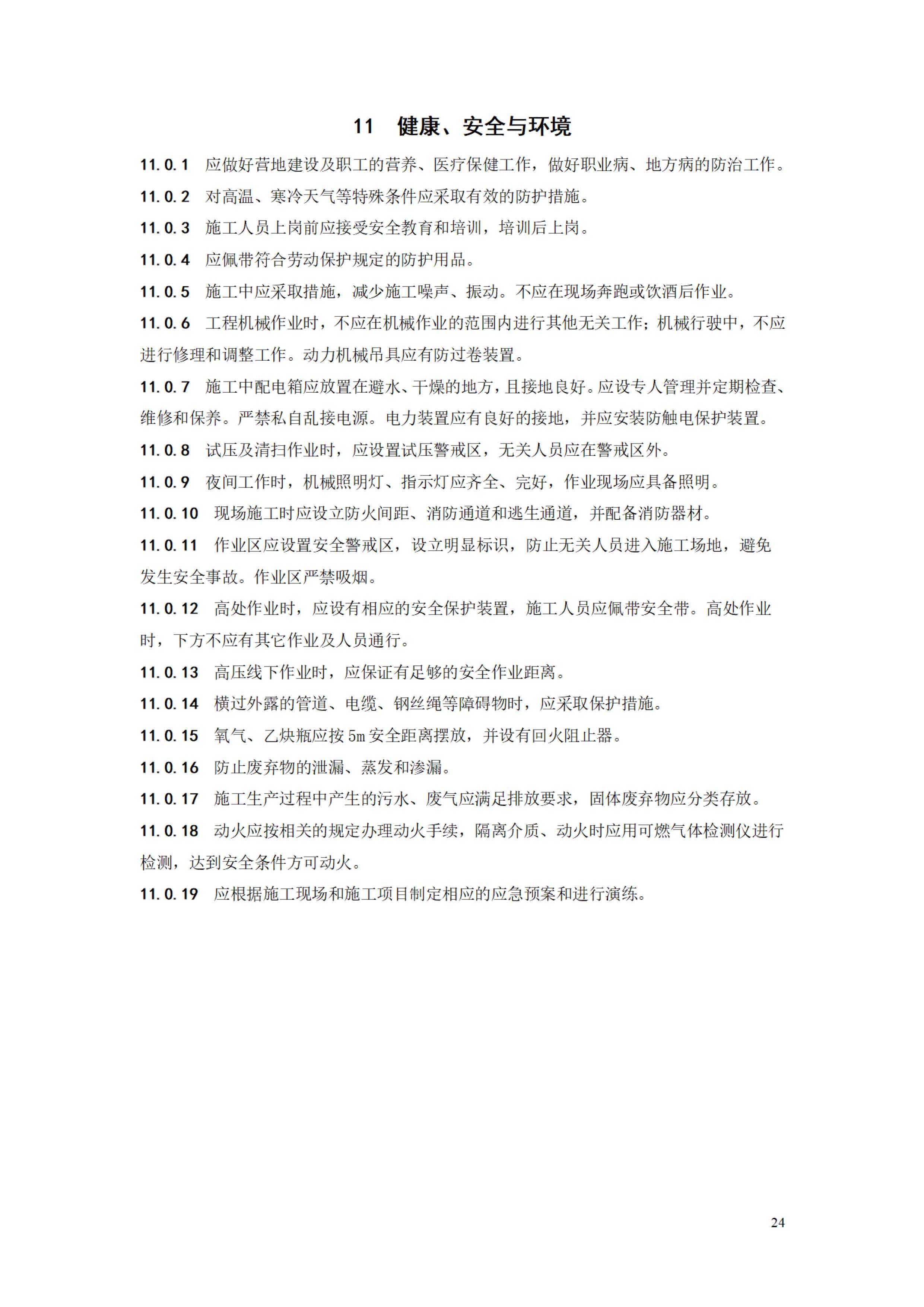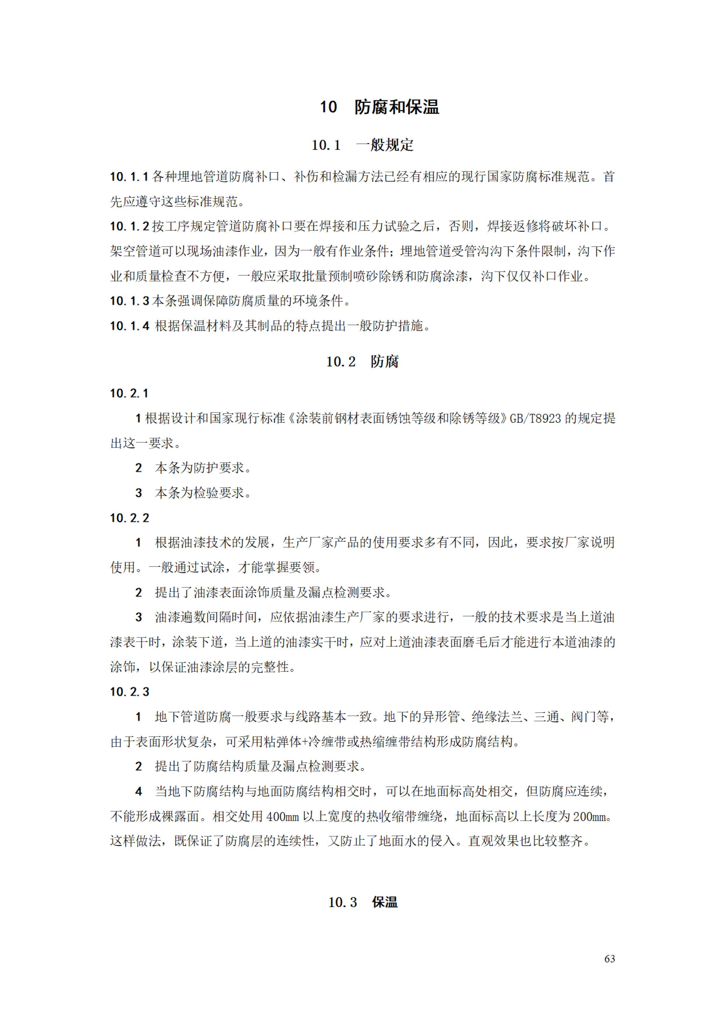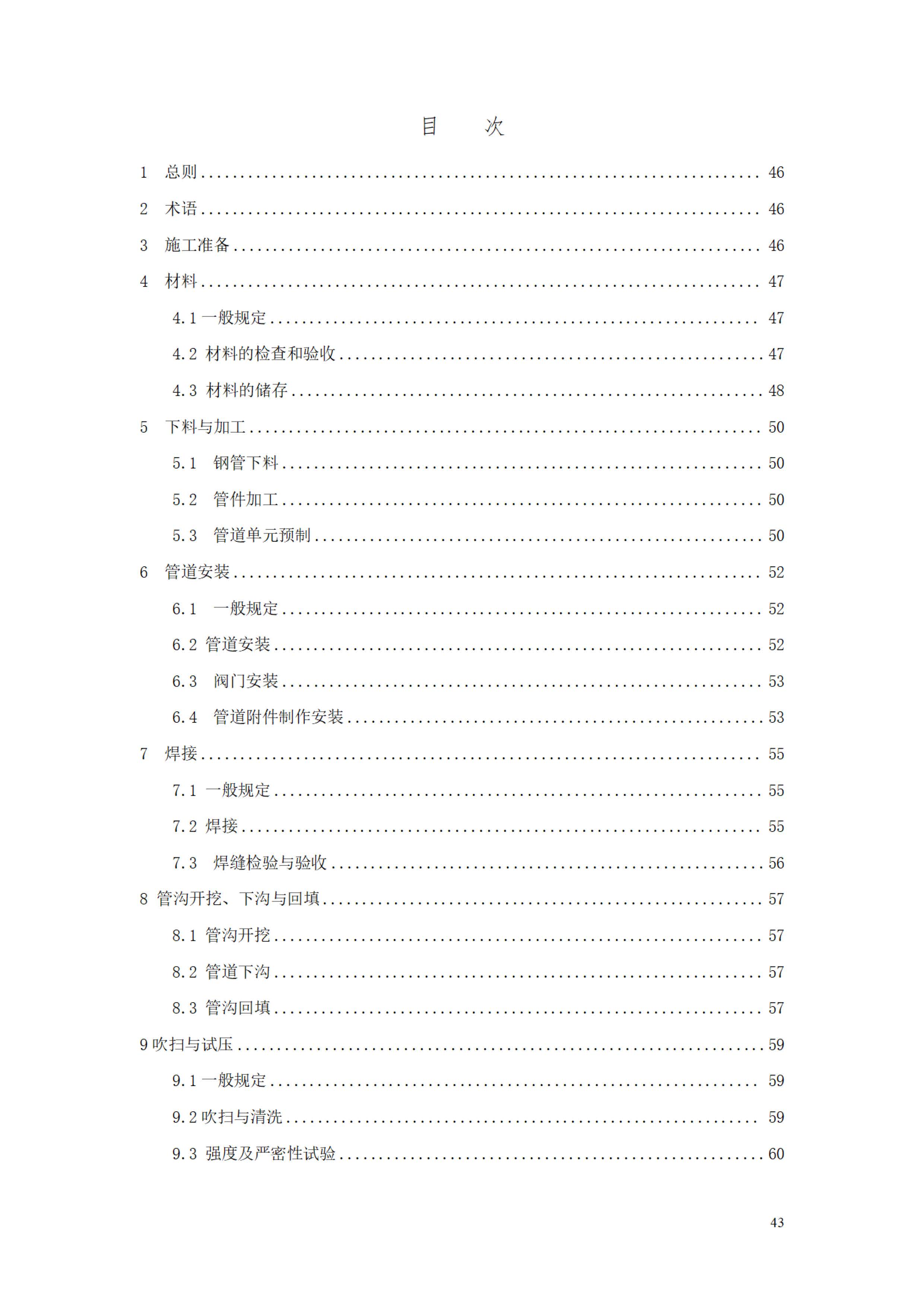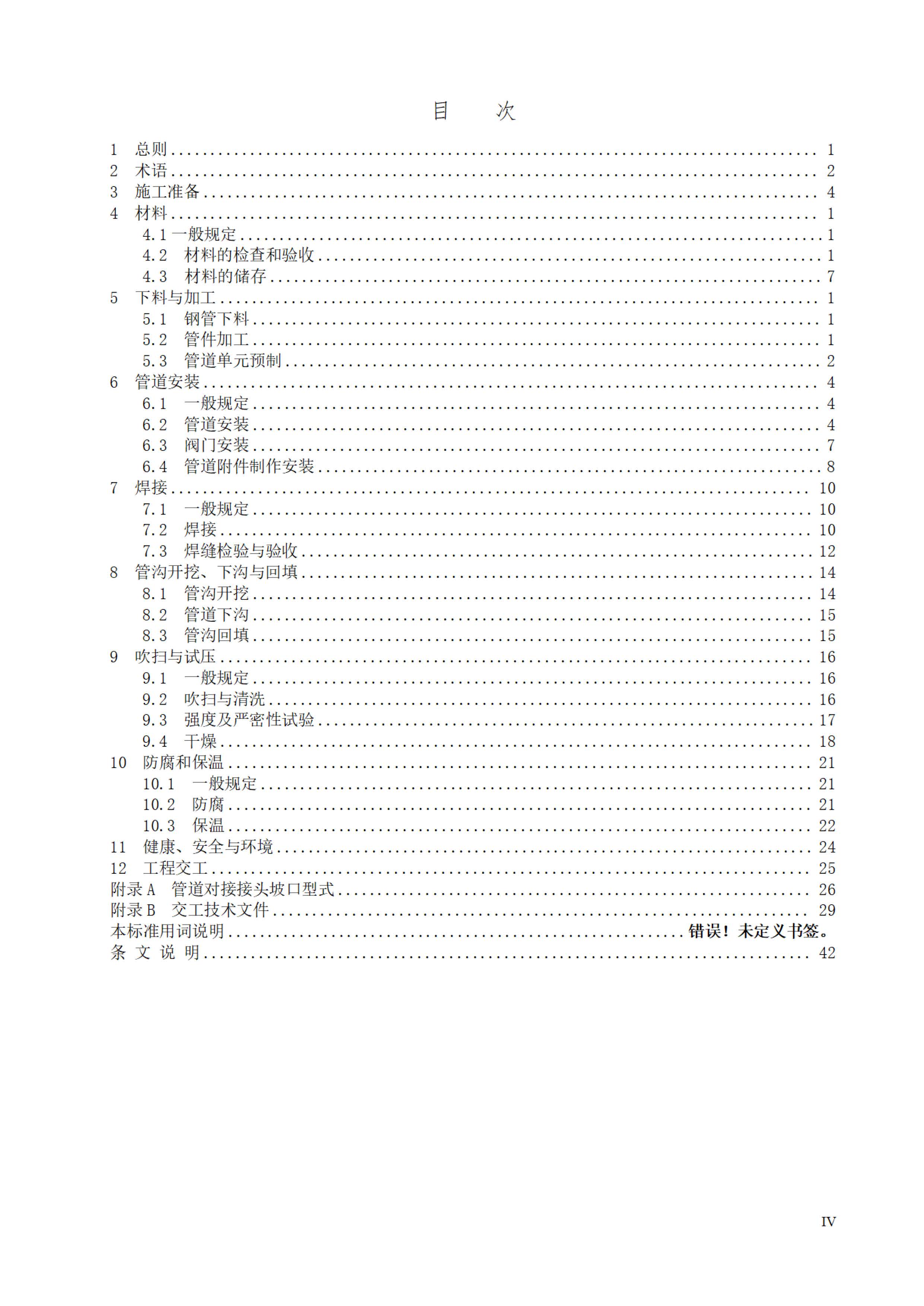 本標準共分12章,主要內容包括:總則,術語和定義,施工準備,材料、管道附件及橇裝設備檢驗,下料與加工,管道安裝,焊接,管溝開挖、下溝與回填,吹掃與試壓,防腐與保溫,健康安全環境,交工驗收等方面的規定。
