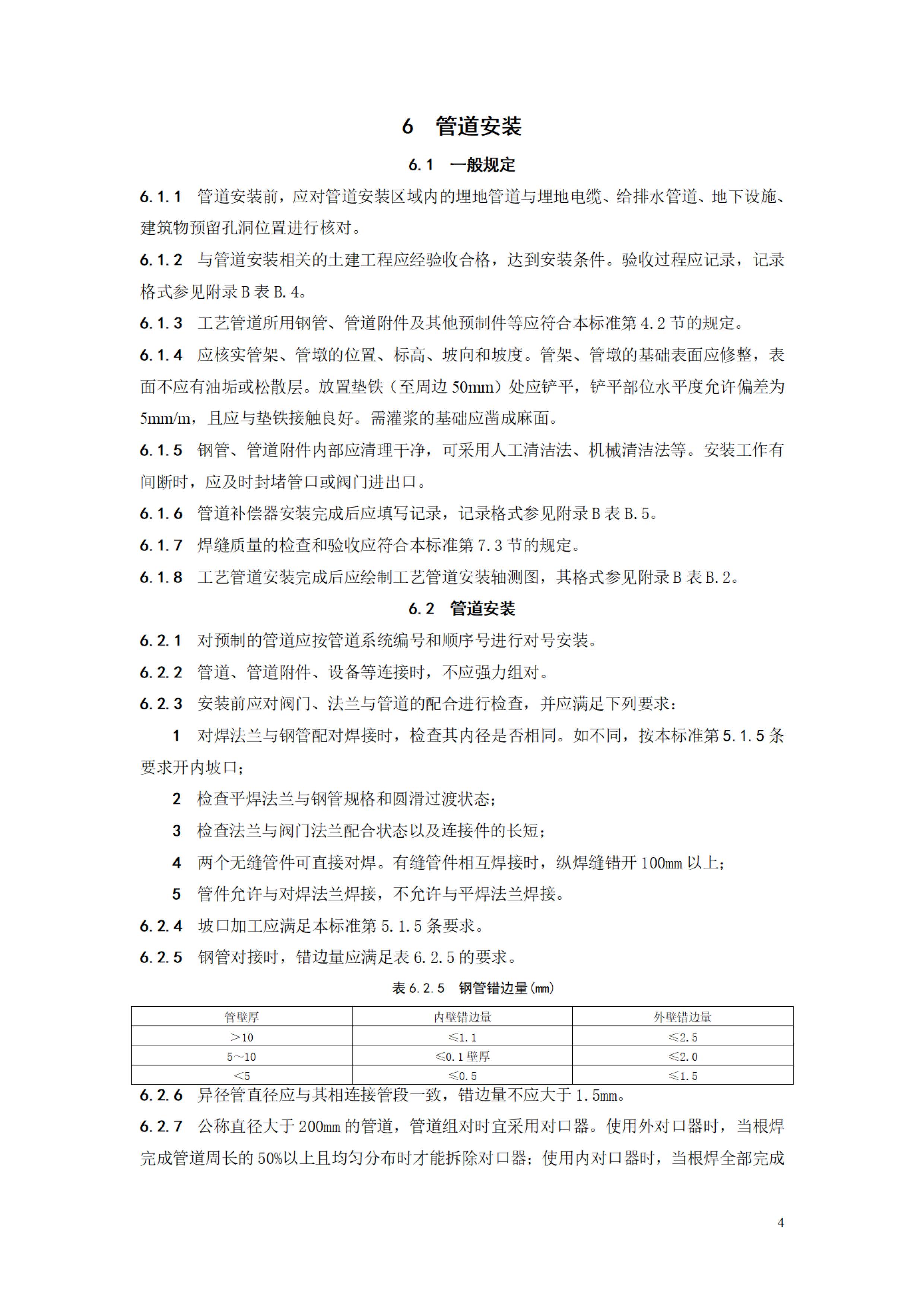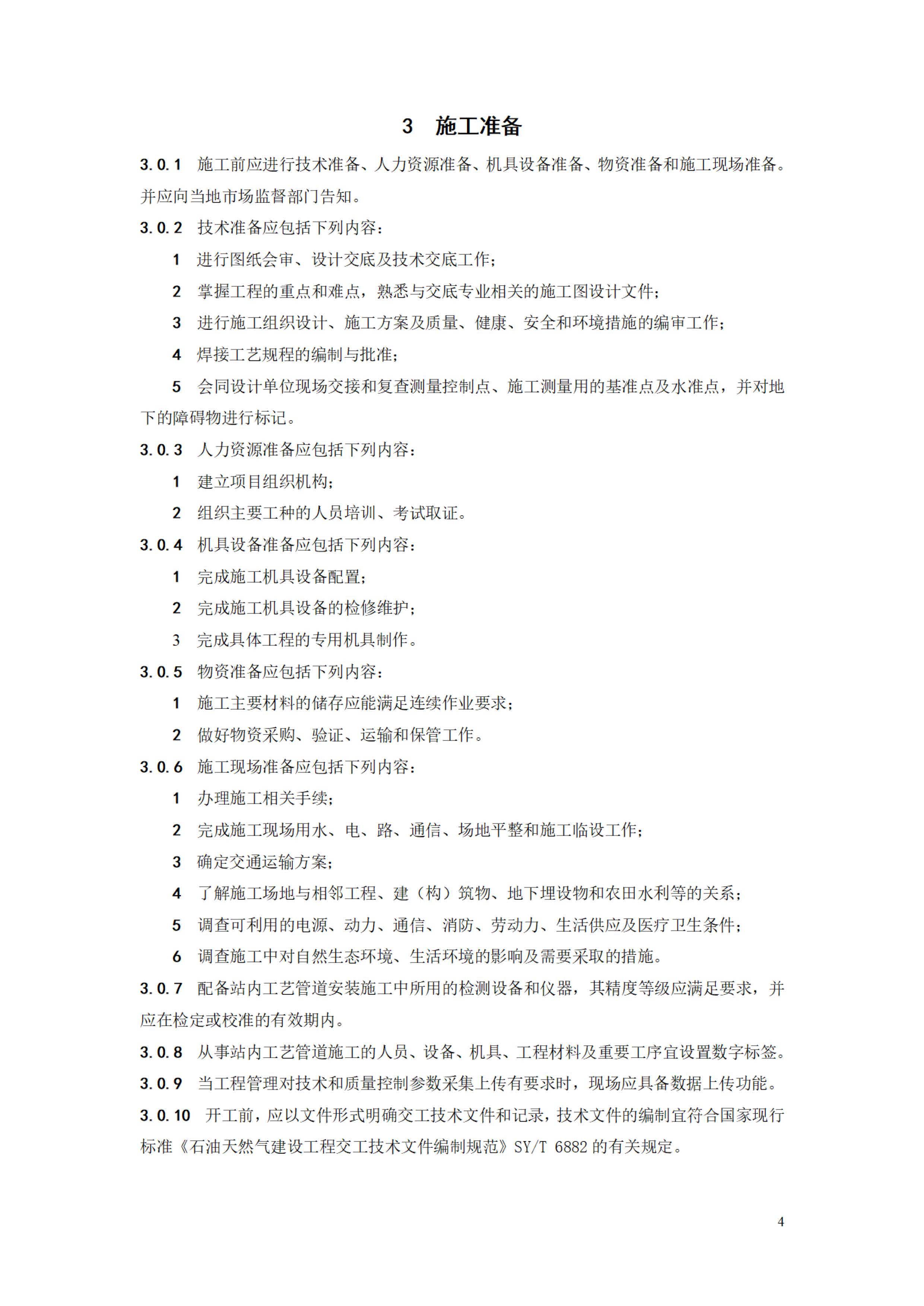 3 原規范第3章整體進行了修訂。并在第3章中增加了3.0.7條,工藝管道安裝施工中所用的檢測設備和儀器,其精度等級應滿足要求,并應在檢定和校準的有效期內使用;增加了3.0.8條:從事站內工藝管道施工的人員、設備、機具、工程材料及重要工序宜設置數字標簽。增加了3.0.9條:當工程管理對技術和質量控制參數采集上傳有要求時,現場應具備數據上傳功能。增加了3.0.10條:開工前,應以文件形式明確交工技術文件和記錄,技術文件的編制宜符合國家現行標準《石油天然氣建設工程交工技術文件編制規范》SY/T 6882的有關規定。