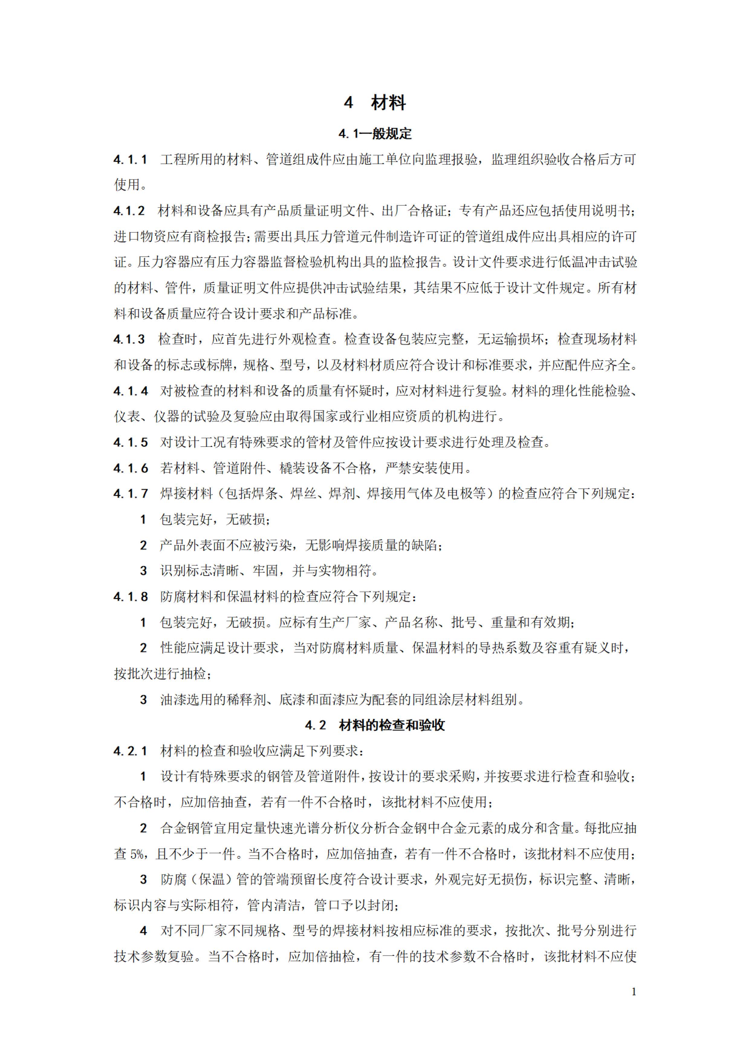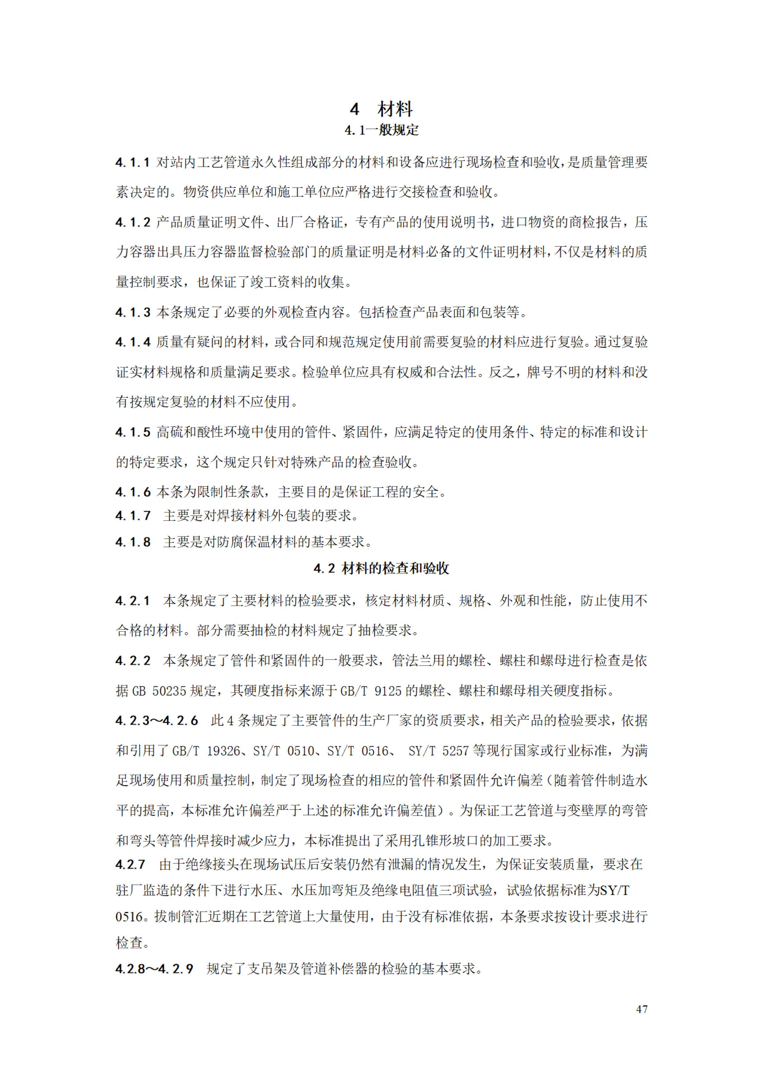 4.2.1本條規定了主要材料的檢驗要求,核定材料材質、規格、外觀和性能,防止使用不合格的材料。部分需要抽檢的材料規定了抽檢要求。