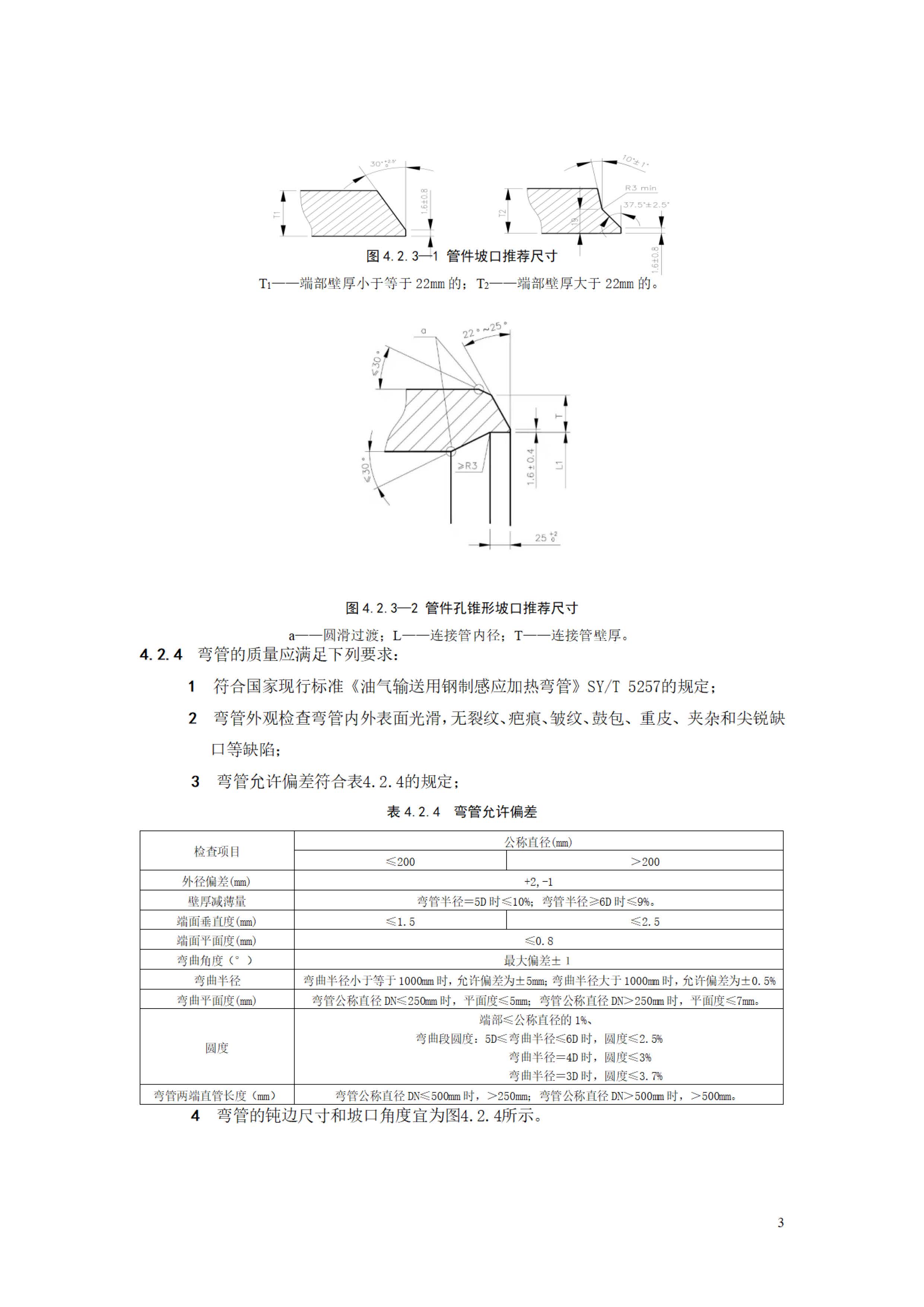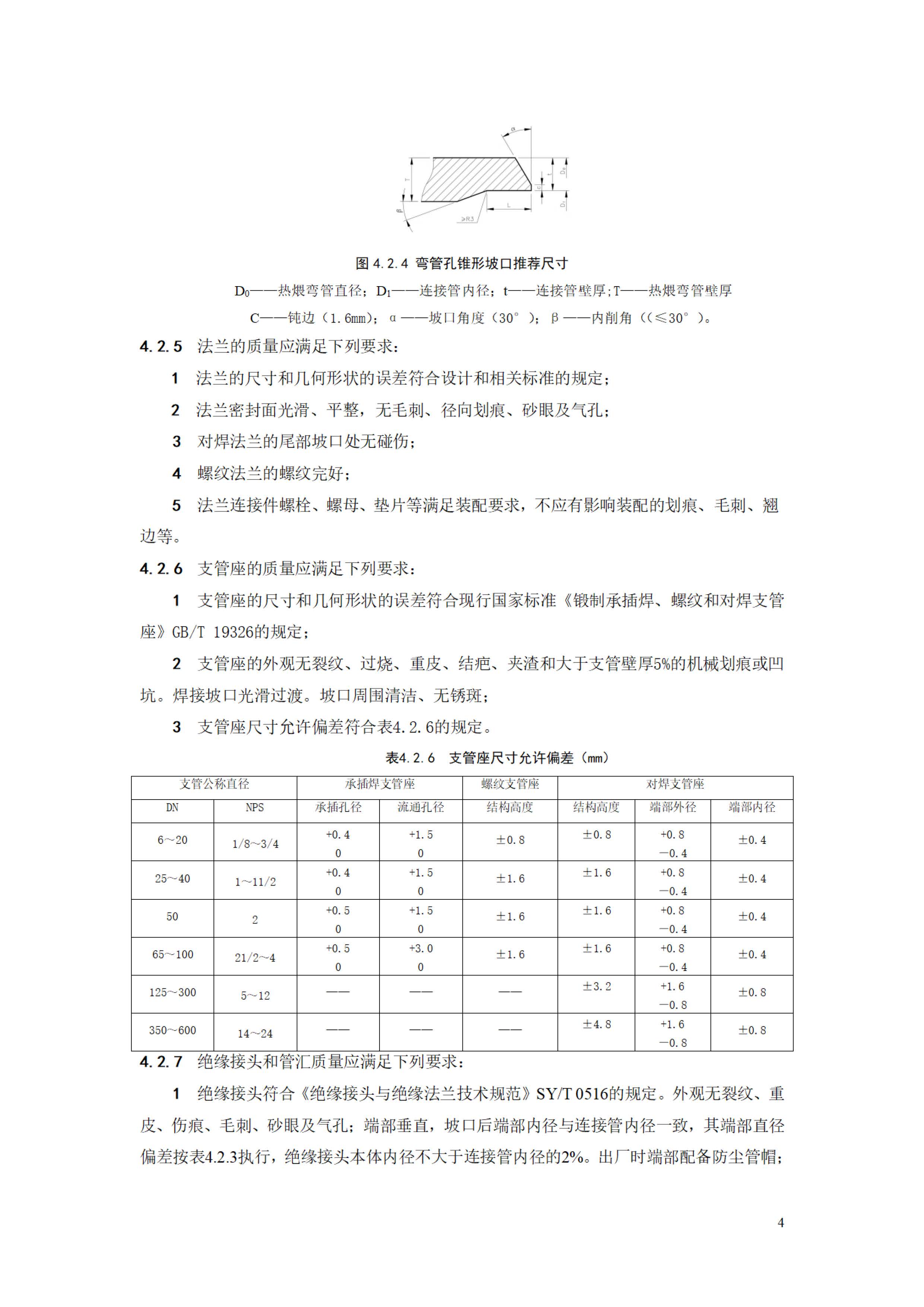 4.2.3~4.2.6此4條規定了主要管件的生產廠家的資質要求,相關產品的檢驗要求,依據和引用了GB/T 19326、SY/T 0510、SY/T 0516、 SY/T 5257等現行國家或行業標準,為滿足現場使用和質量控制,制定了現場檢查的相應的管件和緊固件允許偏差(隨著管件制造水平的提高,本標準允許偏差嚴于上述的標準允許偏差值)。為保證工藝管道與變壁厚的彎管和彎頭等管件焊接時減少應力,本標準提出了采用孔錐形坡口的加工要求。