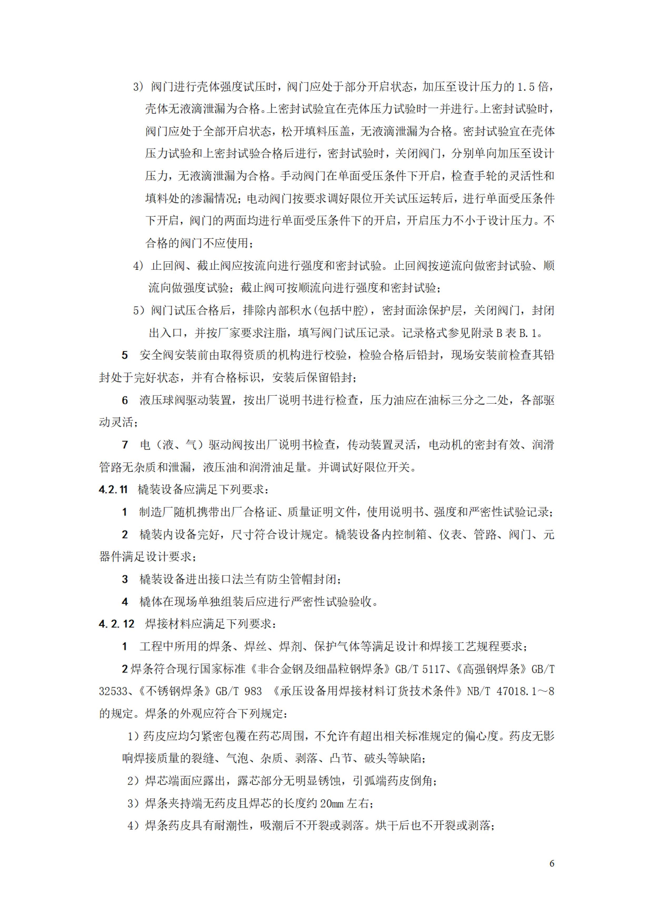 4.2.10本條規定了閥門的檢驗要求,包括資料檢查、外觀檢查、壓力試驗的基本要求,近年來,我國為保證閥門的制造質量,提出了在工廠進行檢驗的要求,本條要求在駐廠監造的條件下進行水壓試驗,可免除現場試驗。同時對非駐廠監造的要求進行現場水壓試驗。工廠水壓試驗依據標準為GB/T 26480。