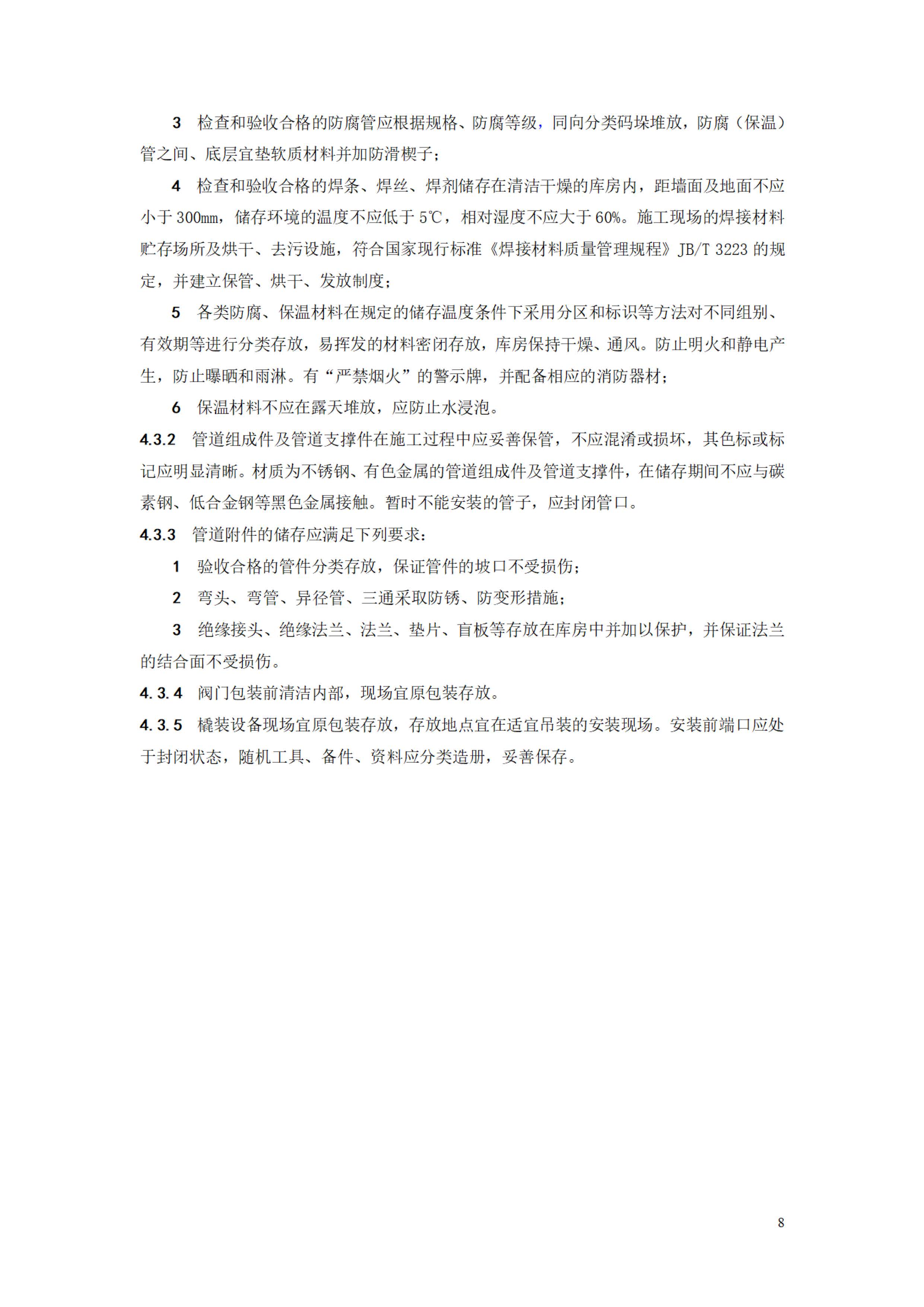 4.3.2本條對不銹鋼管道的存放提出了要求,主要是為了防止碳素鋼對不銹鋼的污染。在儲存過程中,要注意標記,防止材料混用。