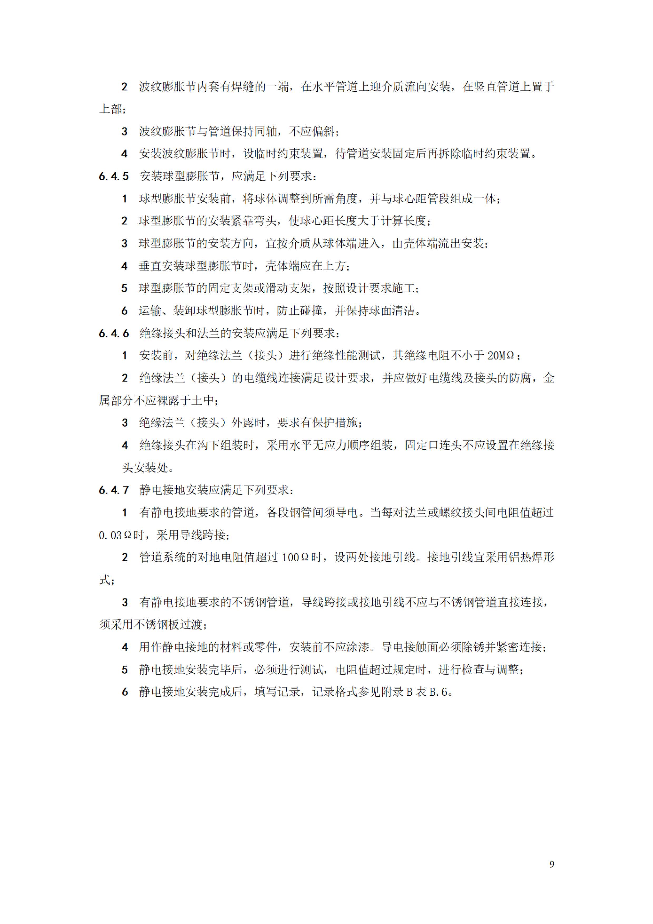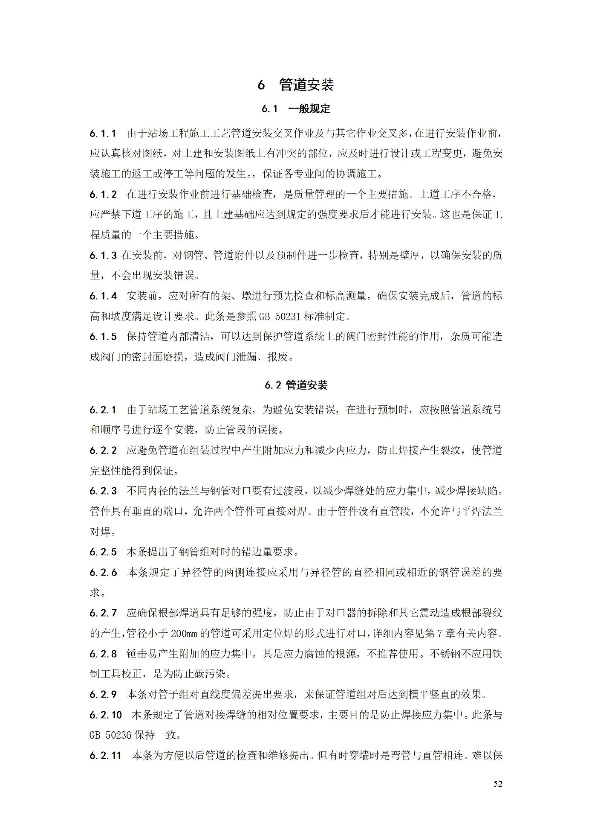6.1.4 安裝前,應對所有的架、墩進行預先檢查和標高測量,確保安裝完成后,管道的標高和坡度滿足設計要求。此條是參照GB 50231標準制定。