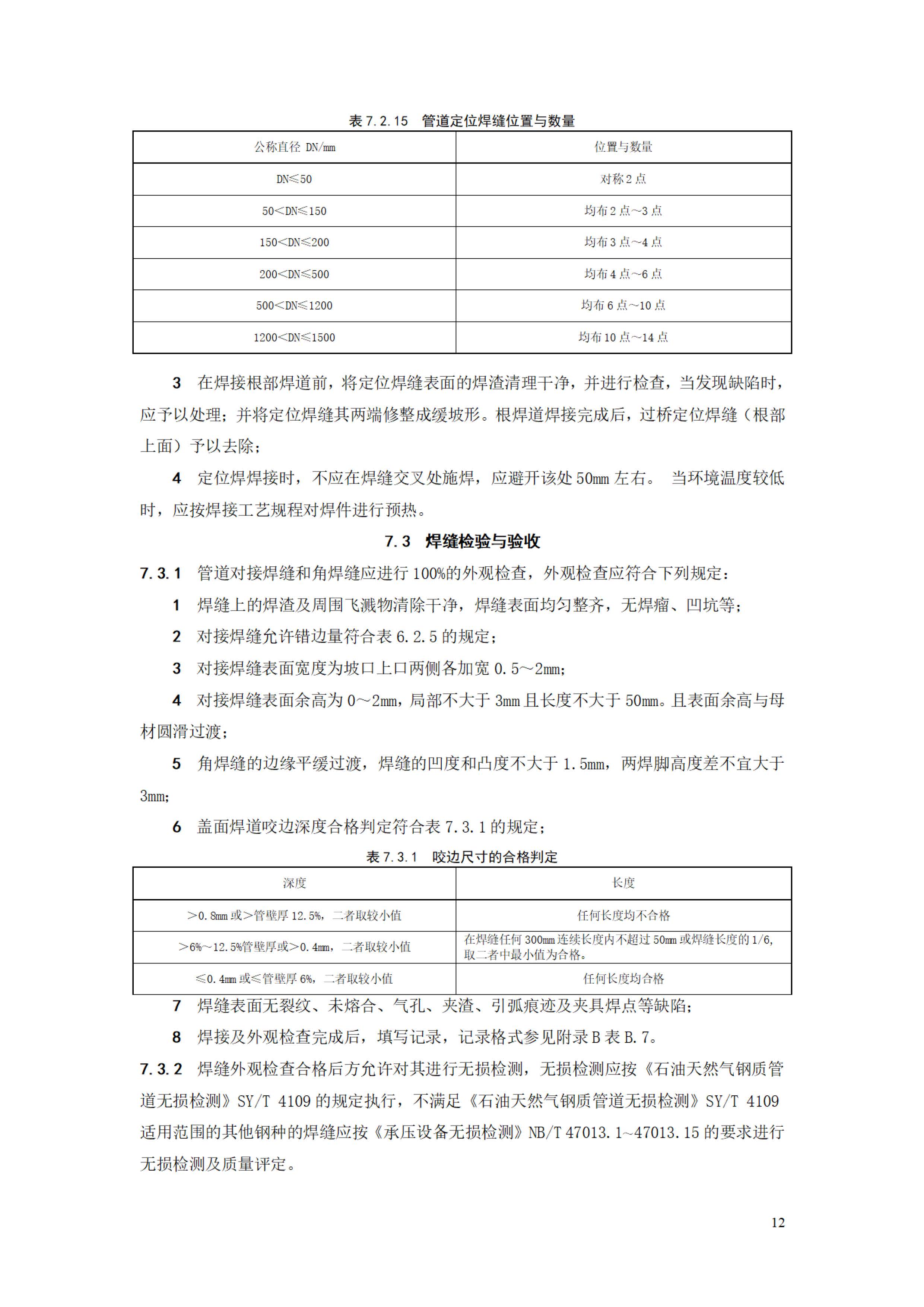7.3.1 站內工藝管道焊縫除了有對接焊縫,還有角接焊縫,兩種焊縫的外觀要求不盡相同,本條將兩種焊縫形式都進行了要求。同時為方便使用,將咬邊尺寸的合格判定,列成了一張表。