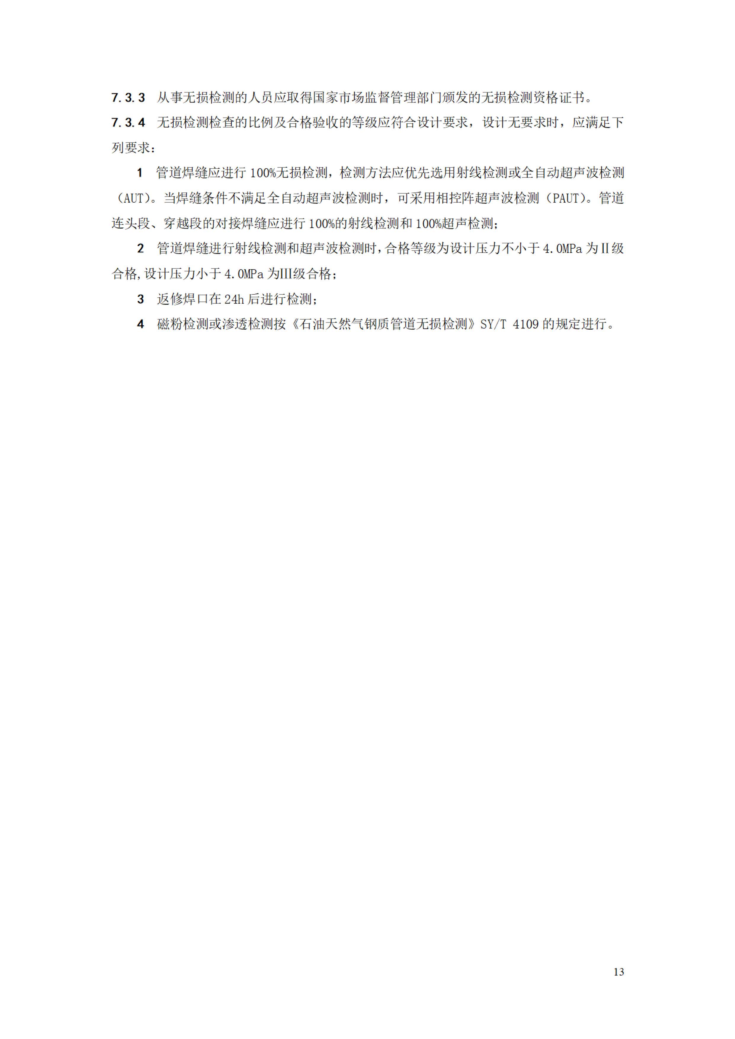 7.3.4本條規定了無損檢測的比例及合格級別及返修要求,由于射線和全自動超聲波(AUT)檢測對焊縫內部缺欠的檢測效果優于表面檢測,困此規定檢測時應優先選擇射線和全自動超聲波檢測方法。當全自動超聲波檢測焊縫條件不具備時,可用相控陣超聲波檢測(PAUT)。由于返修焊口有較大的殘余應力,本條規定返修焊口應在24h后檢測。