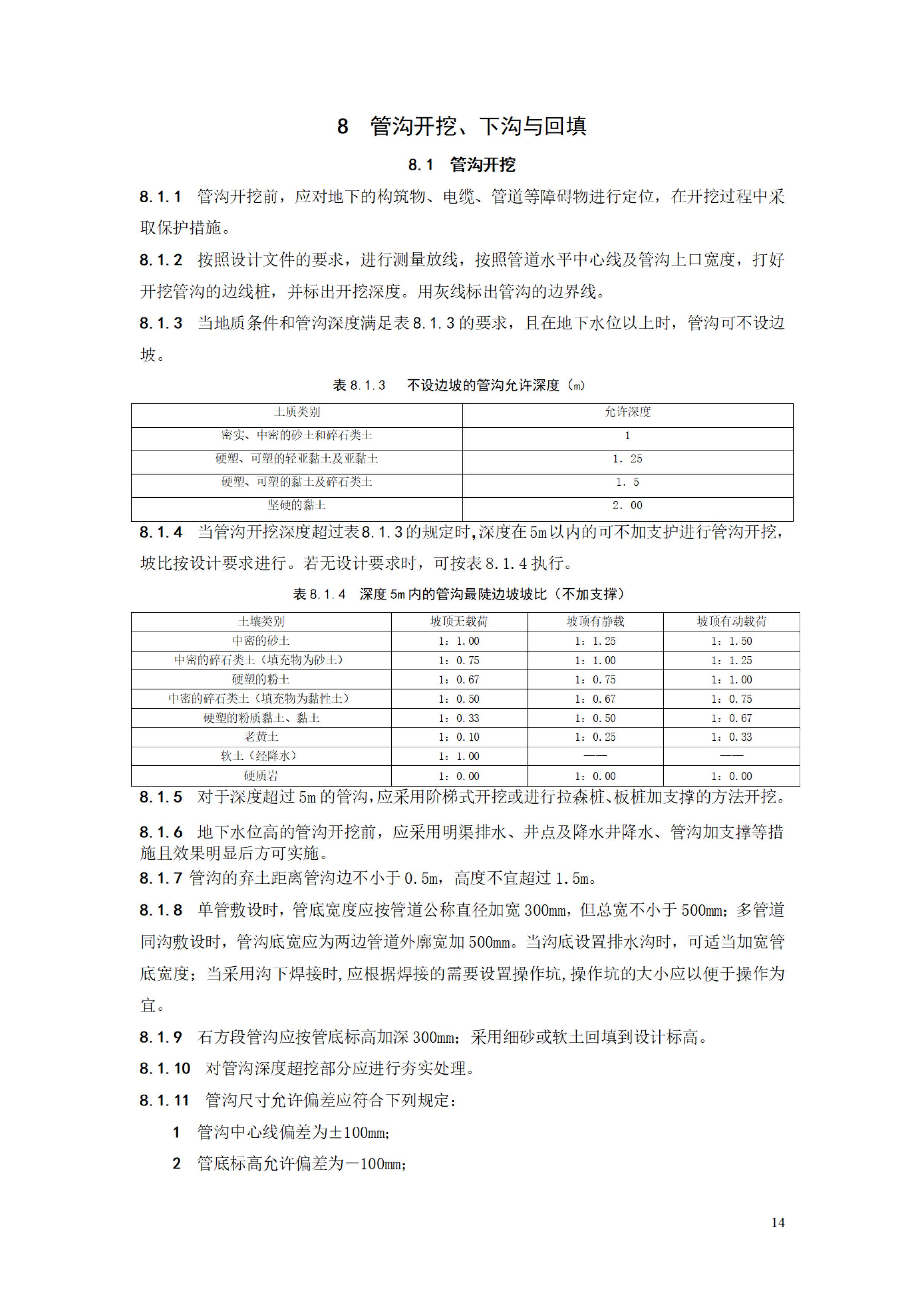 8.1.4 本條的技術參數采用了《油氣輸送管道施工及驗收規范》GB 50369關于管溝開挖的有關規定。