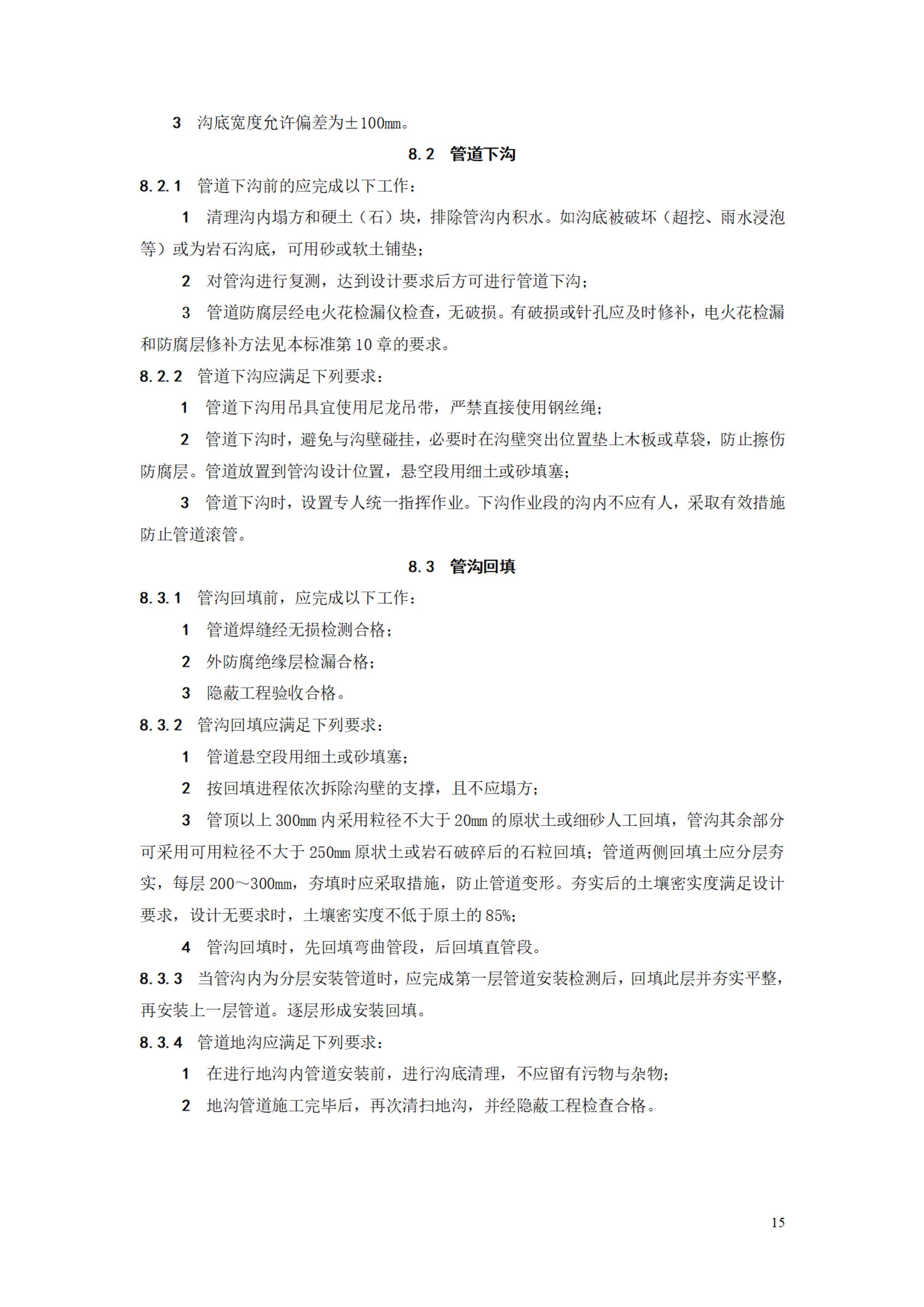8.2.1為了保護管道外的防腐層,提出在管道下溝前應對管溝進行檢查和相關的清理工作。