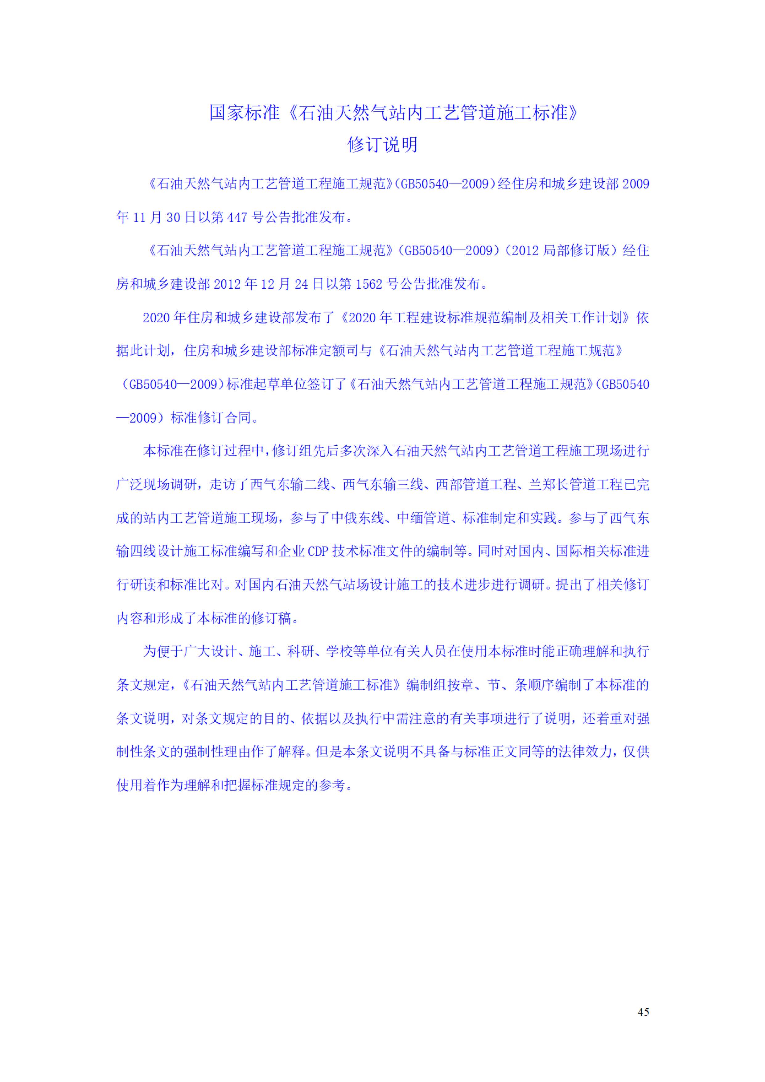 本標準在修訂過程中,標準修訂組總結了原標準執行過程中的不足和多年石油天然氣站內工藝管道工程施工的經驗,借鑒了國內已有的國家標準、行業標準以及國外先進標準,并廣泛征求了國內有關單位、專家的意見,反復修改,最后經審查定稿。