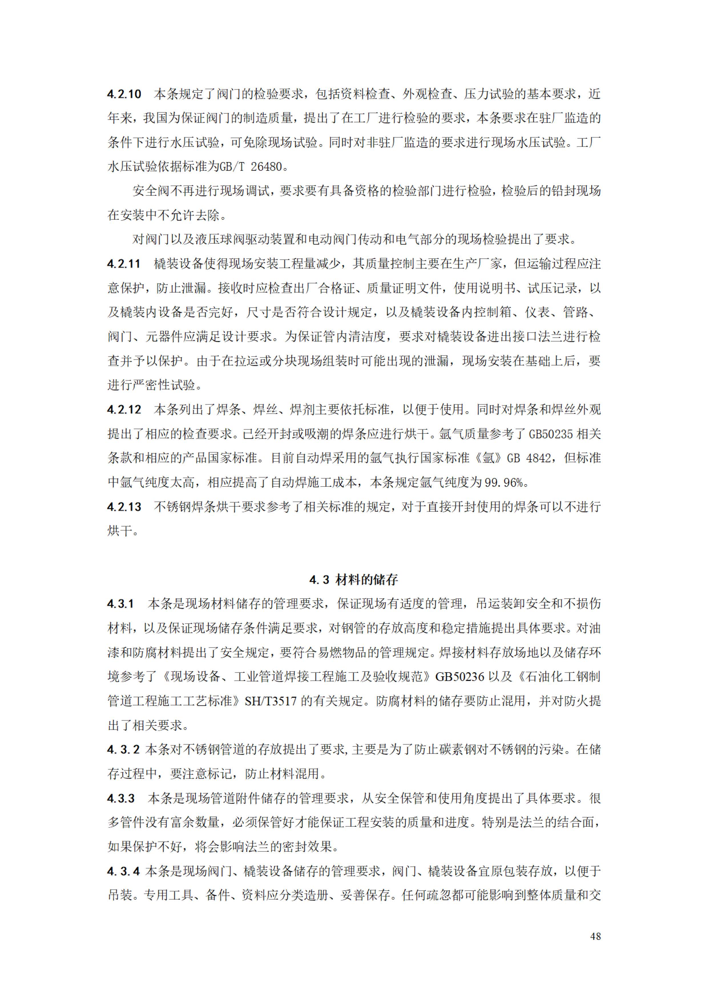 4.3.4 本條是現場閥門、橇裝設備儲存的管理要求,閥門、橇裝設備宜原包裝存放,以便于吊裝。專用工具、備件、資料應分類造冊、妥善保存。任何疏忽都可能影響到整體質量和交工驗收。