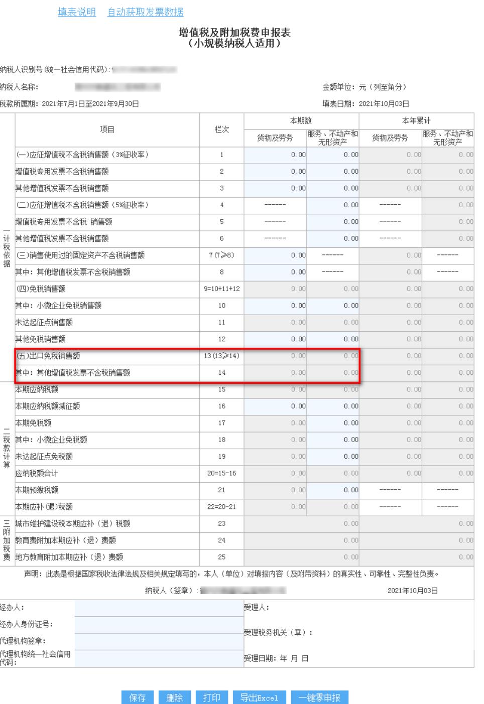 增值稅及附加稅費申報表(小規(guī)模納稅人適用)第13欄“出口免稅銷售額”和第14欄“其中:其他增值稅發(fā)票不含稅銷售額”,面向有出口退免稅資格的納稅人開放,其他納稅人不允許填報。