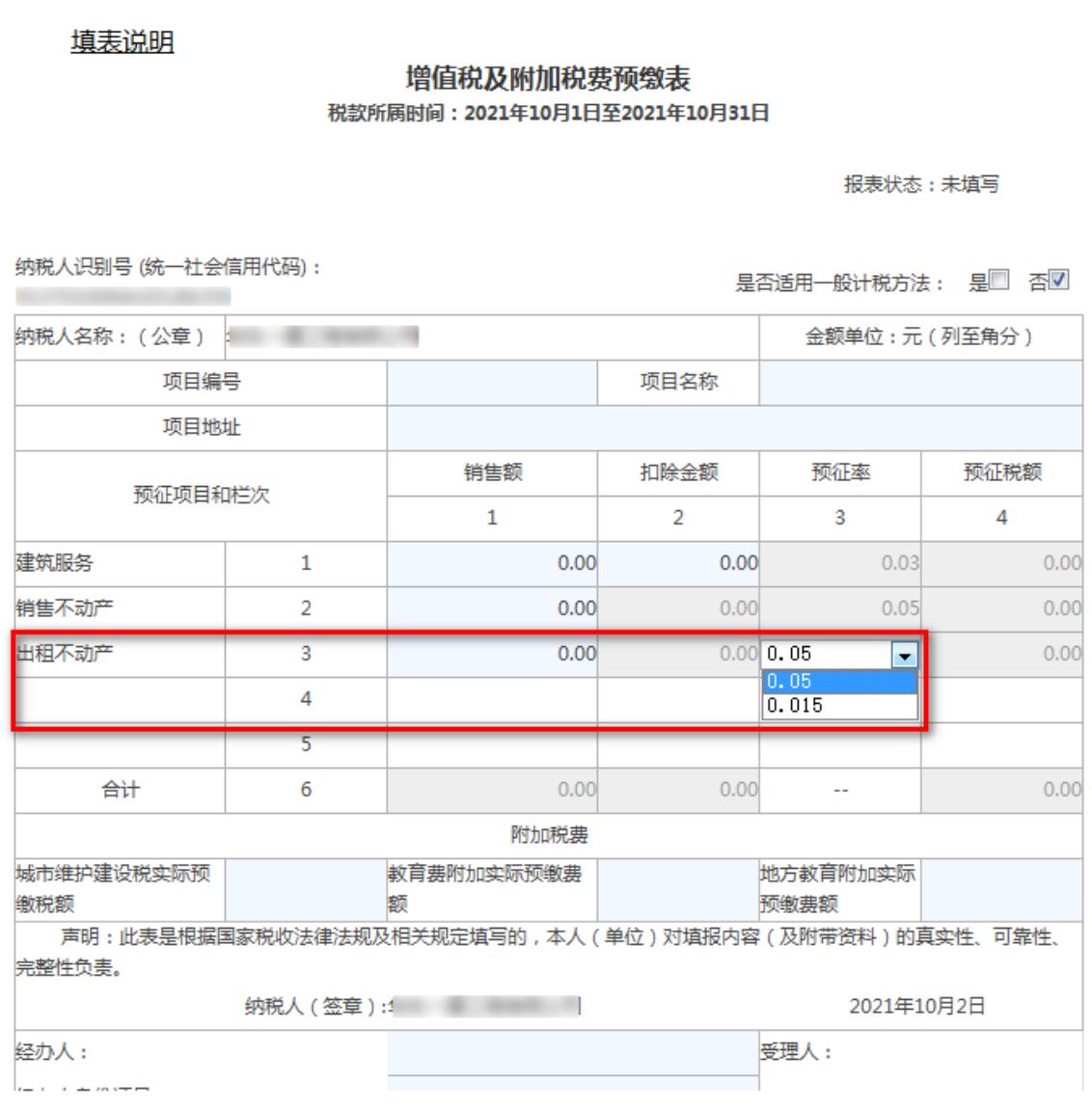 住房租賃企業(yè)納稅人預(yù)繳稅款時,在出租不動產(chǎn)欄次增加1.5%預(yù)征率。