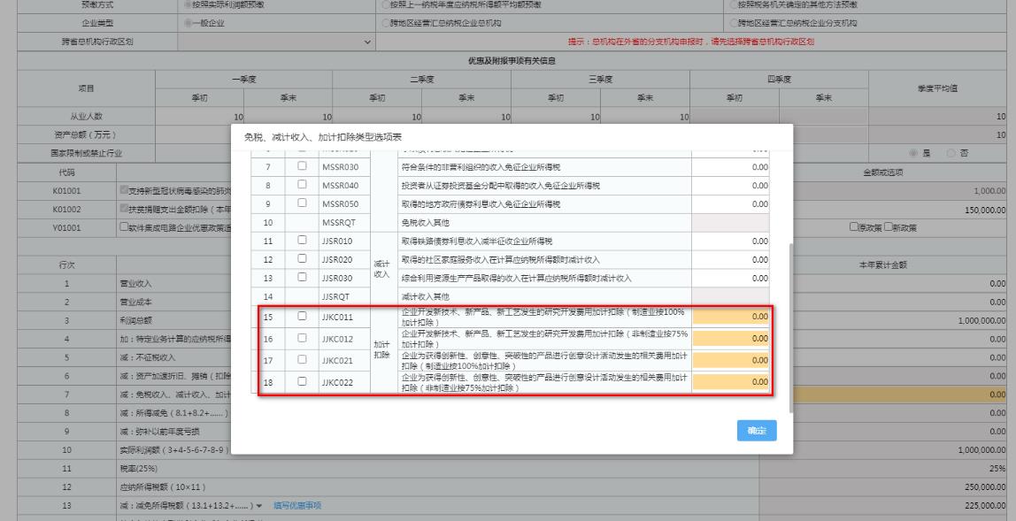 第7行“減:免稅收入、減計收入、加計扣除(7.1+7.2+…)”下拉選項“通用優(yōu)惠事項”增加加計扣除優(yōu)惠事項,如下圖: