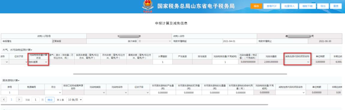 “申報計算及減免信息”模塊下,系統(tǒng)對采用排污系數(shù)、物料衡算、抽樣測算方法計算污染物排放量的污染物,設(shè)置為無法選擇錄入減免條款。如下圖: