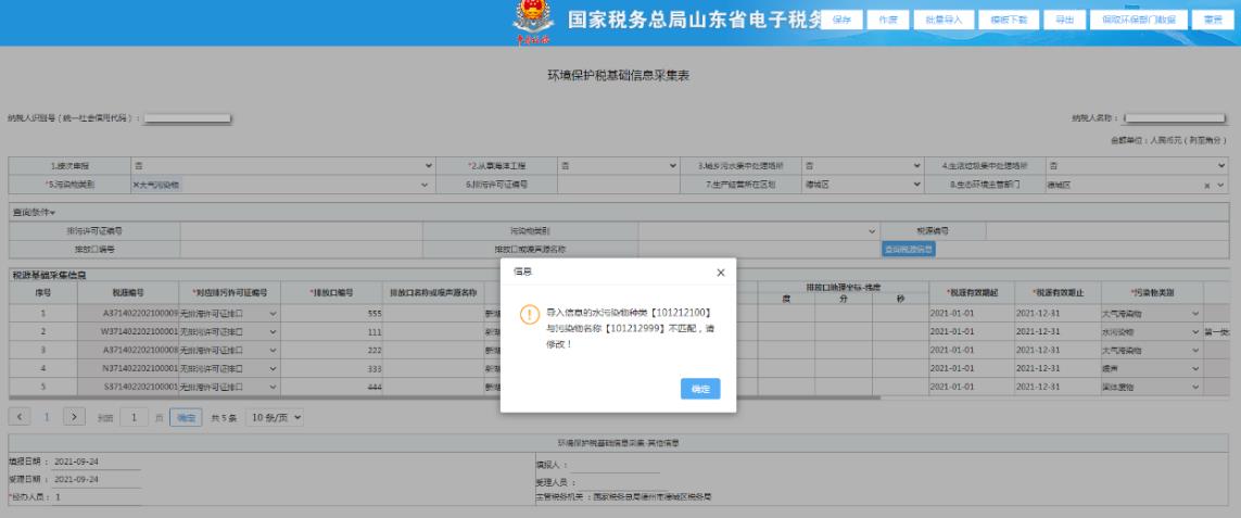 如納稅人選擇使用模版導(dǎo)入時,增加水污染物種類與污染物名稱匹配校驗,當模板中的水污染物種類與污染物名稱不匹配、污染物排放量計算方法不匹配時,系統(tǒng)彈出相關(guān)提示信息,納稅人應(yīng)修改模板中的信息后,再重新導(dǎo)入。
