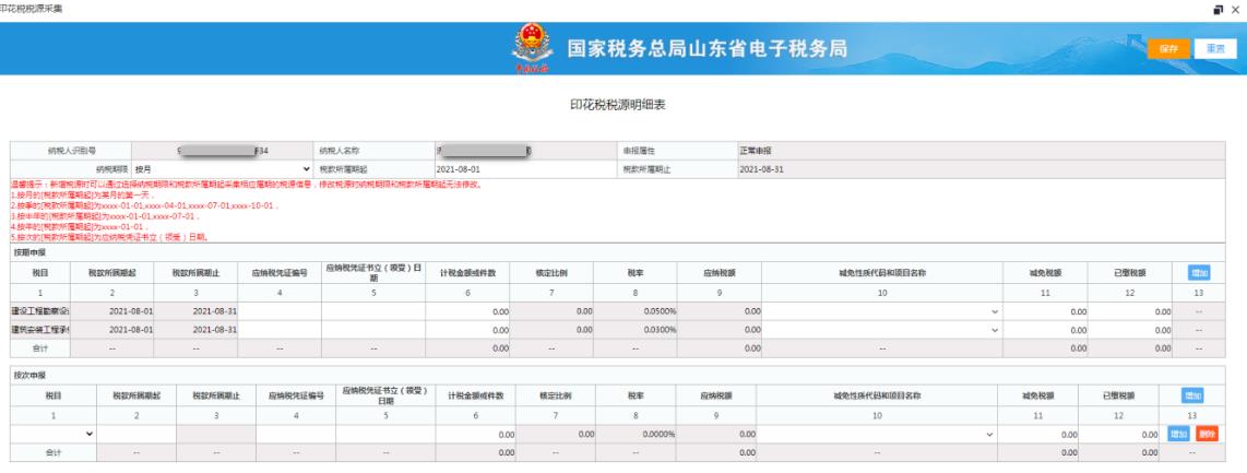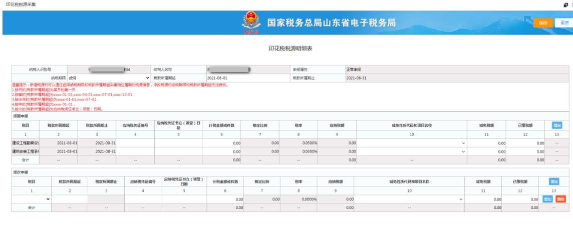 2、點擊“新增稅源”按鈕,系統(tǒng)自動根據(jù)納稅人印花稅稅種認定的納稅期限帶出上個稅款所屬期的應(yīng)申報信息。如下圖: