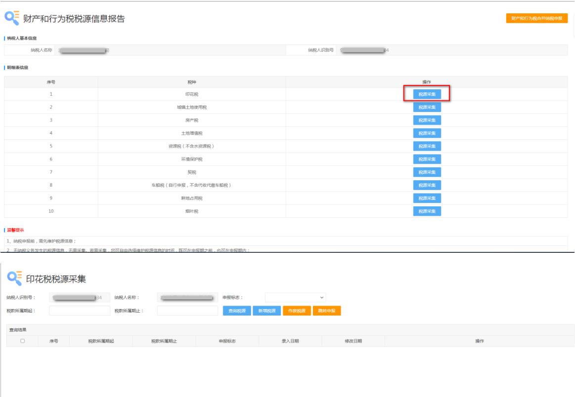 1、登錄山東省電子稅務(wù)局在“我要辦稅”-“綜合信息報告”-“稅源信息報告”下選擇“財產(chǎn)和行為稅稅源信息報告”菜單,選擇印花稅 后方的稅源采集按鈕,進入印花稅稅源采集功能。如下圖: