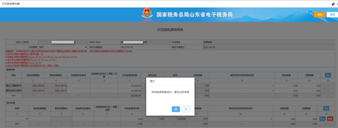 3、填寫數(shù)據(jù)后點擊“保存”按鈕,系統(tǒng)提示保存稅源信息成功,是否立即申報。如下圖: