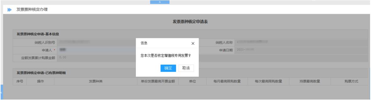 新辦納稅人首次核定增值稅發(fā)票票種信息,系統(tǒng)提示“您本次是否核定增值稅專用發(fā)票?”,選擇“確定”,如下圖所示: