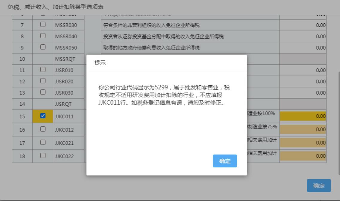 (4)當納稅人稅務(wù)登記信息中行業(yè)門類不是“制造業(yè)”時(登記信息中所屬行業(yè)不為國標行業(yè)代碼C,1300-4390),且勾選此項優(yōu)惠時,系統(tǒng)彈出提示,不允許選擇。