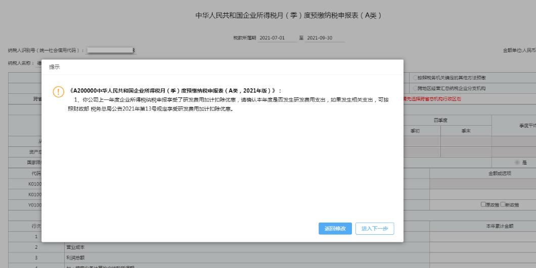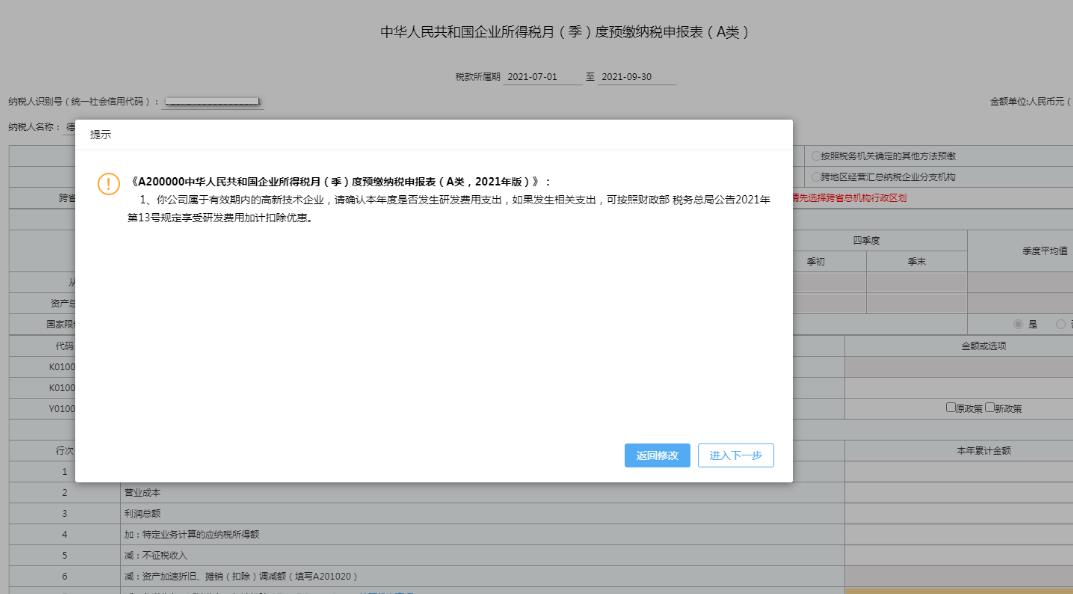 高新技術(shù)企業(yè)進行企業(yè)所得稅第三季度預(yù)繳申報時如未選擇享受研發(fā)費用加計扣除優(yōu)惠,系統(tǒng)彈出提醒信息。