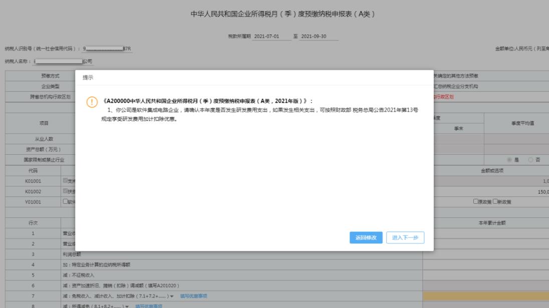軟件集成電路企業(yè)進行企業(yè)所得稅第三季度預(yù)繳申報時,如未選擇享受研發(fā)費用加計扣除優(yōu)惠,系統(tǒng)彈出提醒信息。
