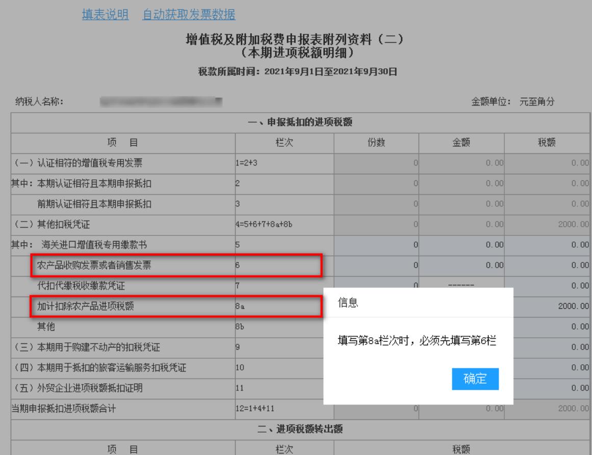 點擊“我要辦稅”—“稅費申報及繳納”,左側(cè)功能菜單—“增值稅及附加稅費申報”—“增值稅及附加稅費一般納稅人申報”—“增值稅及附加稅費申報表附列資料(二)”,納稅人如填寫了8a欄次,報表保存時校驗第6欄“農(nóng)產(chǎn)品收購發(fā)票或者銷售發(fā)票”是否已填寫,如第6欄為空,則彈出提示信息,如下圖所示: