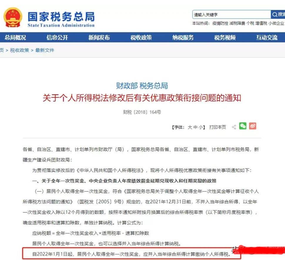 通知明確:自2022年1月1日起,居民個人取得全年一次性獎金不能再單獨計稅,應并入當年綜合所得計算繳納個人所得稅。(此處已添加小程序,請到今日頭條客戶端查看)