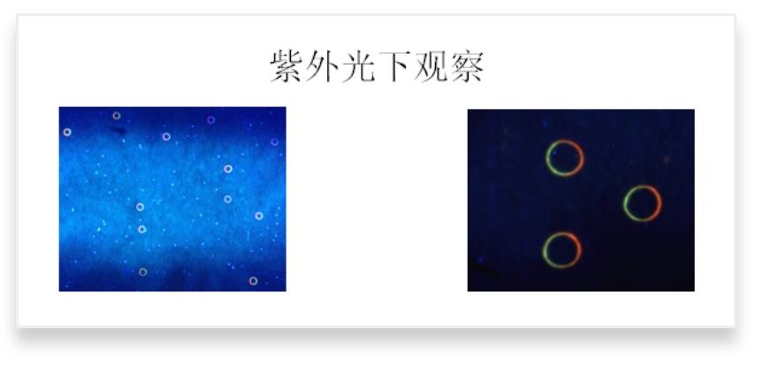 使用標準365nm紫外光源以小于45度的角度照射環形纖維,靠近光源的半圓環為紅色,遠離光源的半圓環為黃綠色。