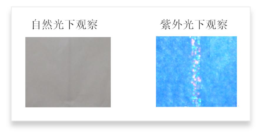 在日光下對光觀察防偽線呈現黑色線狀水印,使用標準365nm紫外光源垂直照射防偽線呈現紅藍熒光點形成的條狀熒光帶。