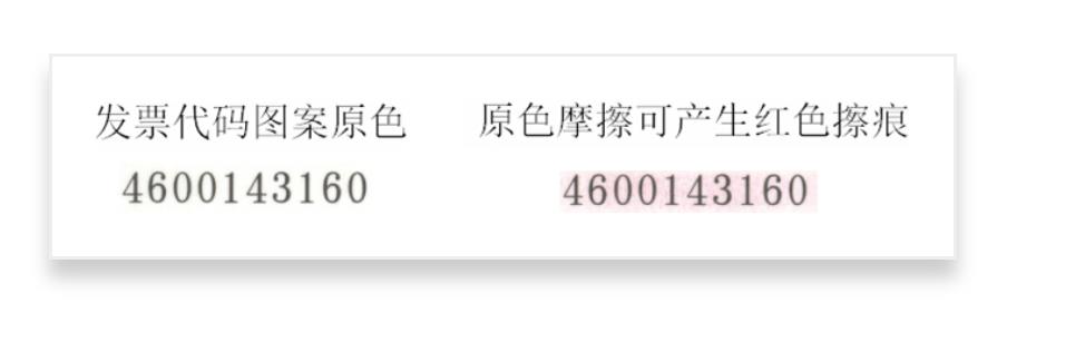 發票各聯次左上方的發票代碼使用防偽油墨印制,油墨印記在外力摩擦作用下可以發生顏色變化,產生紅色擦痕(如下圖所示)。