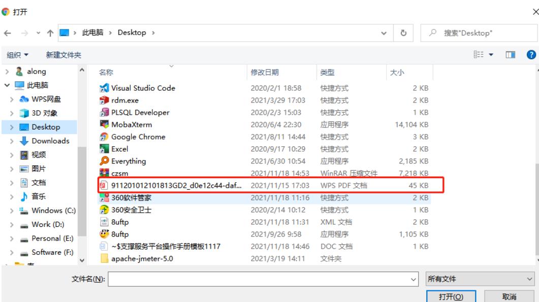(3)點擊對話框中的“瀏覽”按鈕,選中需要導入的文件(支持文件格式為pdf、ofd),點擊“打開”按鈕。如下圖所示。