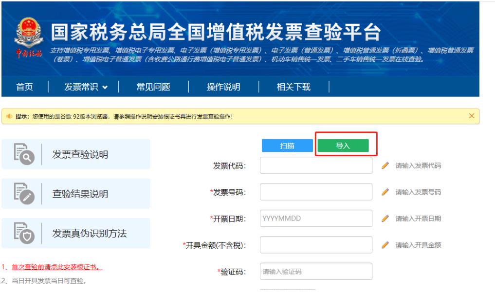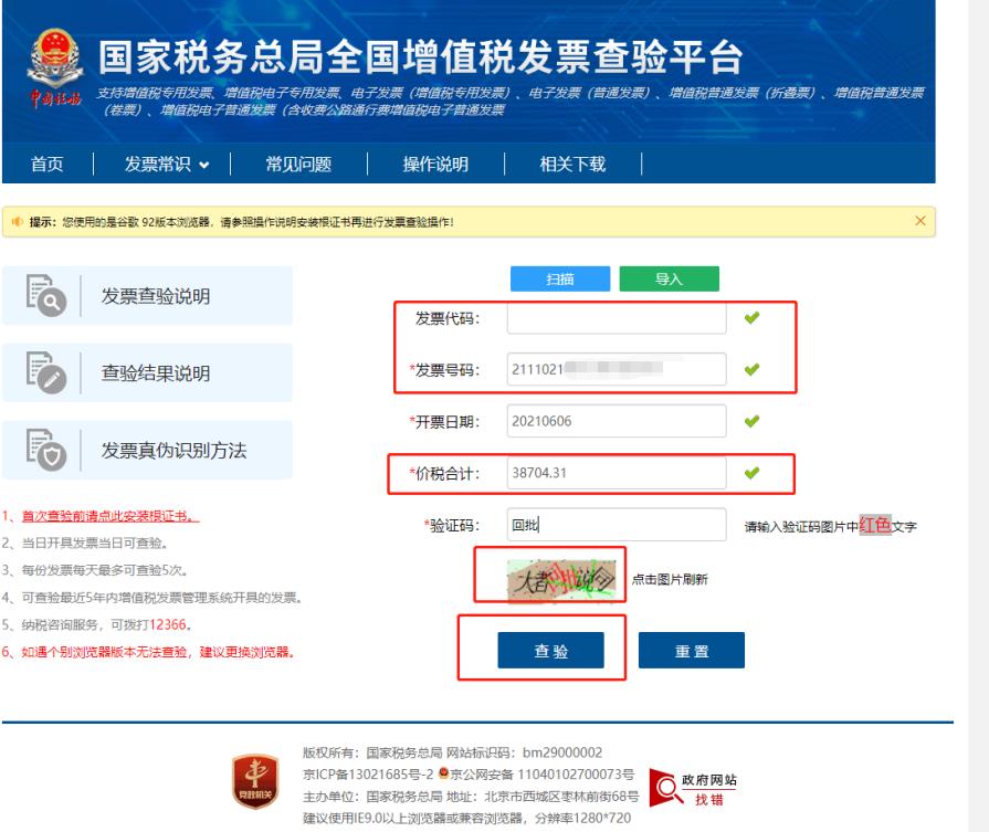 注意:增值稅發票查驗平臺目前支持火狐(50.1)、谷歌(55.0)、IE8以上版本瀏覽器。非上述瀏覽器可能會導致顯示異常。