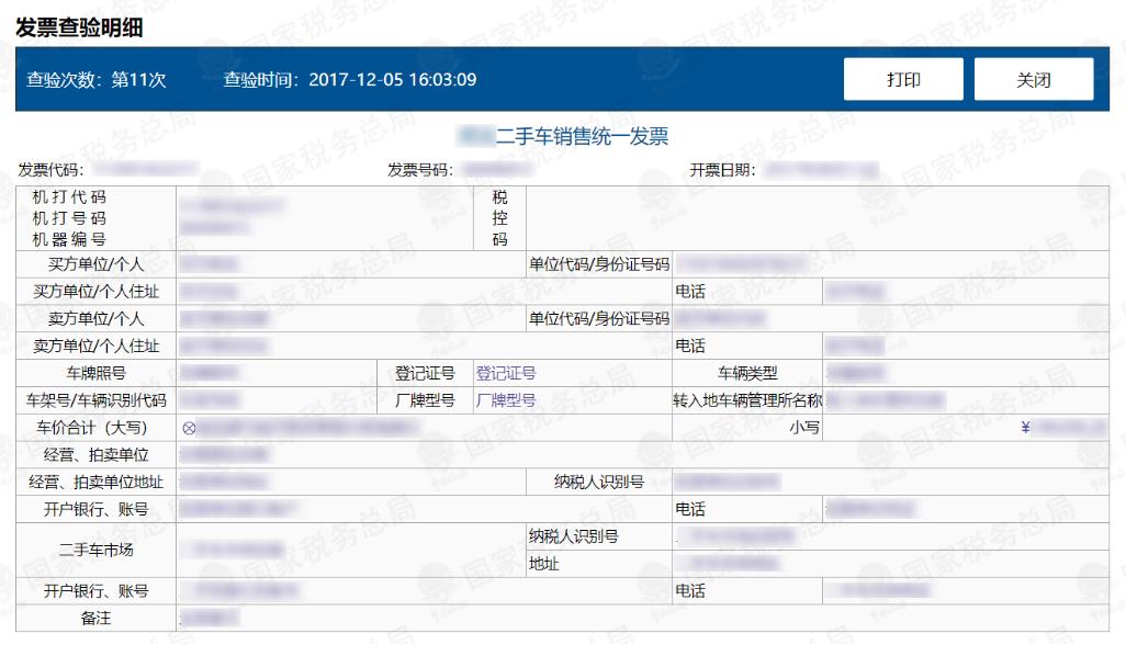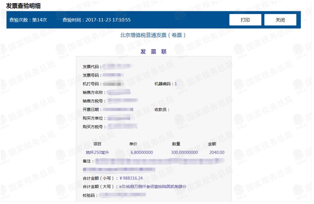 1、納稅人輸入的發票校驗信息與稅務機關電子信息一致,則顯示相關的發票詳細信息(如發票已被開具方作廢,則在查驗結果中顯示“作廢”標識)。