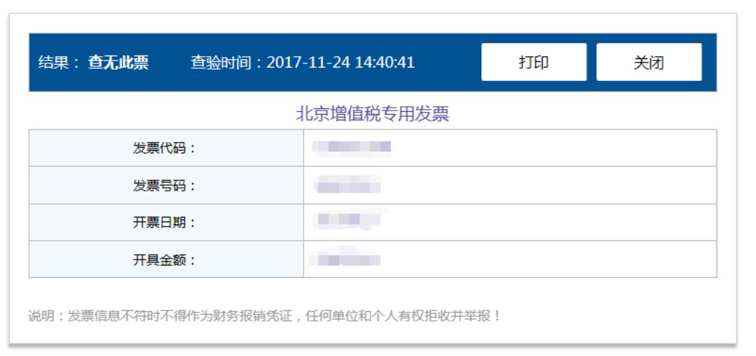 4、查無此票:由于存在開具方離線自開票、發票電子數據的同步滯后、查驗人錄入錯誤等問題,導致相關發票在稅務機關的電子信息中無法檢索到。如果確認輸入項無誤后,請于第二天再行查驗。
