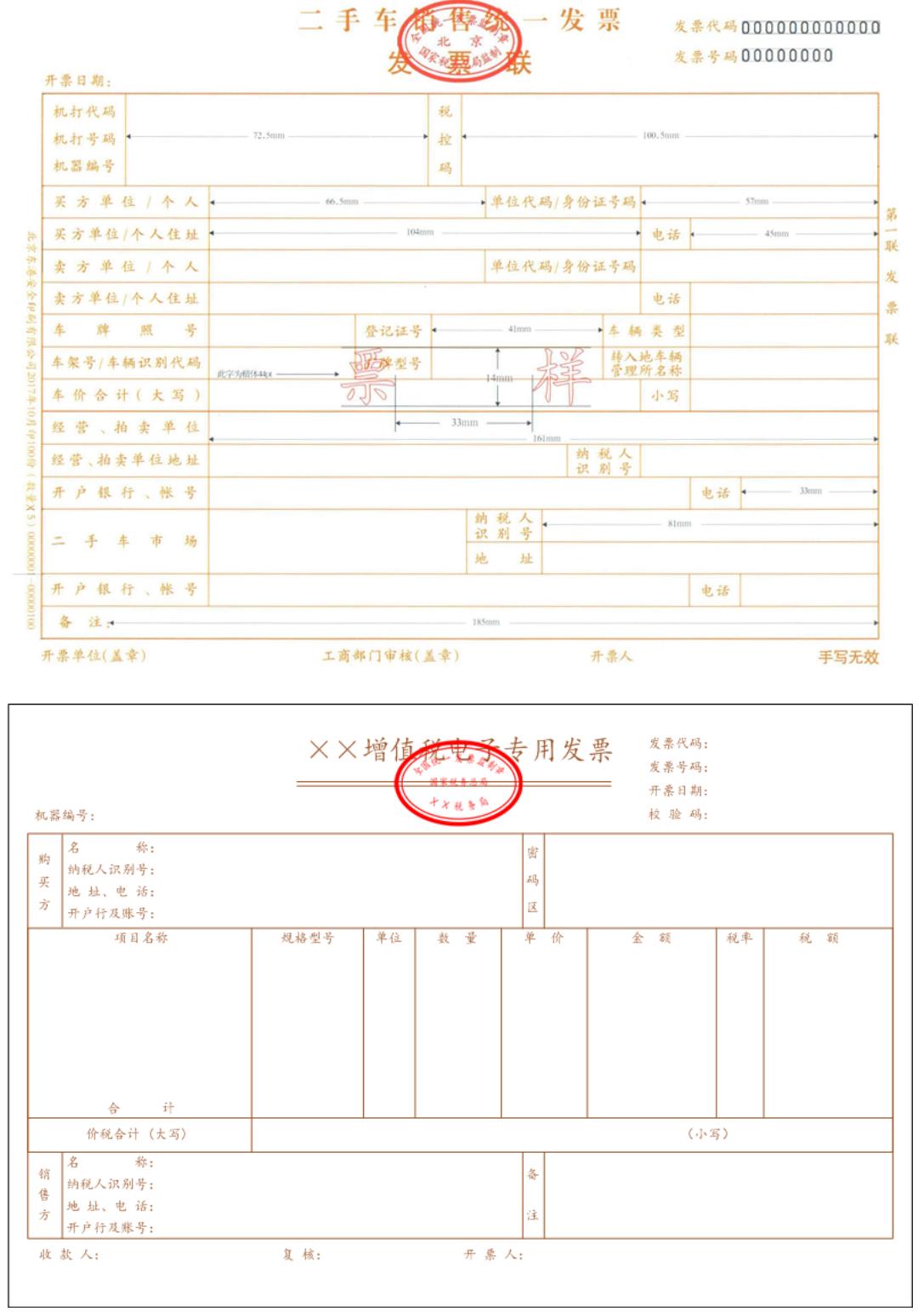 • 二手車銷售統一發票:二手車經銷企業、經紀機構和拍賣企業,在銷售、中介和拍賣二手車收取款項時,通過開票軟件開具的發票。