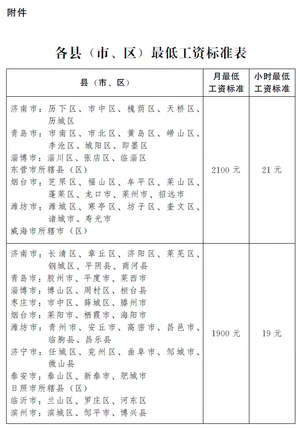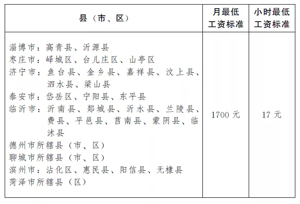 山東省月最低工資標準為2100元、1900元、1700元;小時最低工資標準為21元、19元、17元。