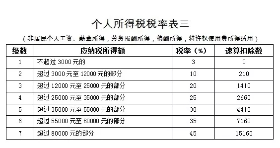 非居民個(gè)人的工資、薪金所得,以每月收入額減除費(fèi)用五千元后的余額為應(yīng)納稅所得額;勞務(wù)報(bào)酬所得、稿酬所得、特許權(quán)使用費(fèi)所得,以每次收入額為應(yīng)納稅所得額,適用按月?lián)Q算后的非居民個(gè)人月度稅率表計(jì)算應(yīng)納稅額。其中,勞務(wù)報(bào)酬所得、稿酬所得、特許權(quán)使用費(fèi)所得以收入減除百分之二十的費(fèi)用后的余額為收入額。稿酬所得的收入額減按百分之七十計(jì)算。