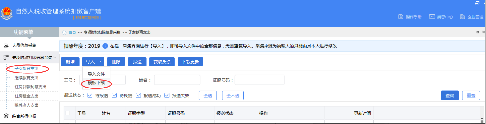 扣繳客戶端軟件下載地址:專項附加扣除信息采集-選擇任一專項附加扣除項目-導入-模板下載